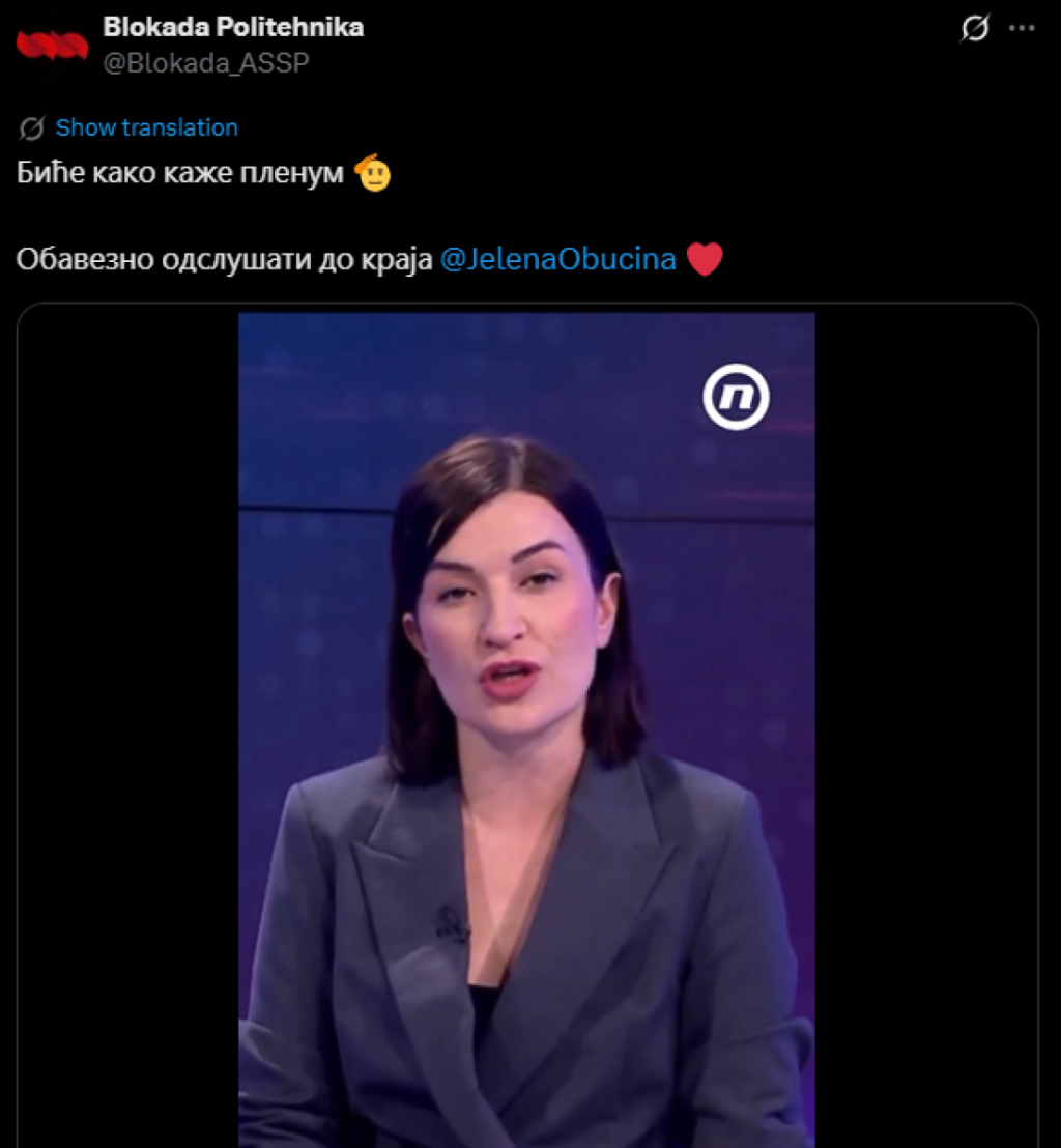Svi profili studenata u blokadi na društvenim mrežama podržali su sinoćni uvodnik tajkunske voditeljke Jelene Obućine, u kojem je jasno napala Dijanu Hrku.