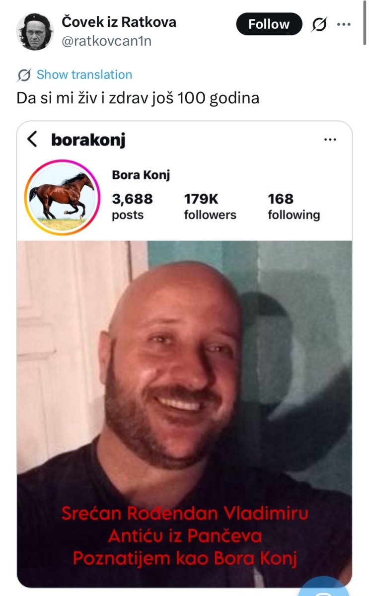Podsetimo, upravo je Babić bio taj kome su blokaderi nedavno ugasili nalog na društvenoj mreži Iks i to zato što ne mogu da podnesu činjenicu da upravo on svakodnevno raskrinkava njihove gluposti, laži i izmišljotine. Poznati biznismen je nakon toga napravio novi profil i nastavio da nervira zgubidane. Poslednji u nizu je takozvani Bora Konj, jedan od najostrašćenijih blokaderskih botova, čiji je identitet danas razotkrio upravo Babić.