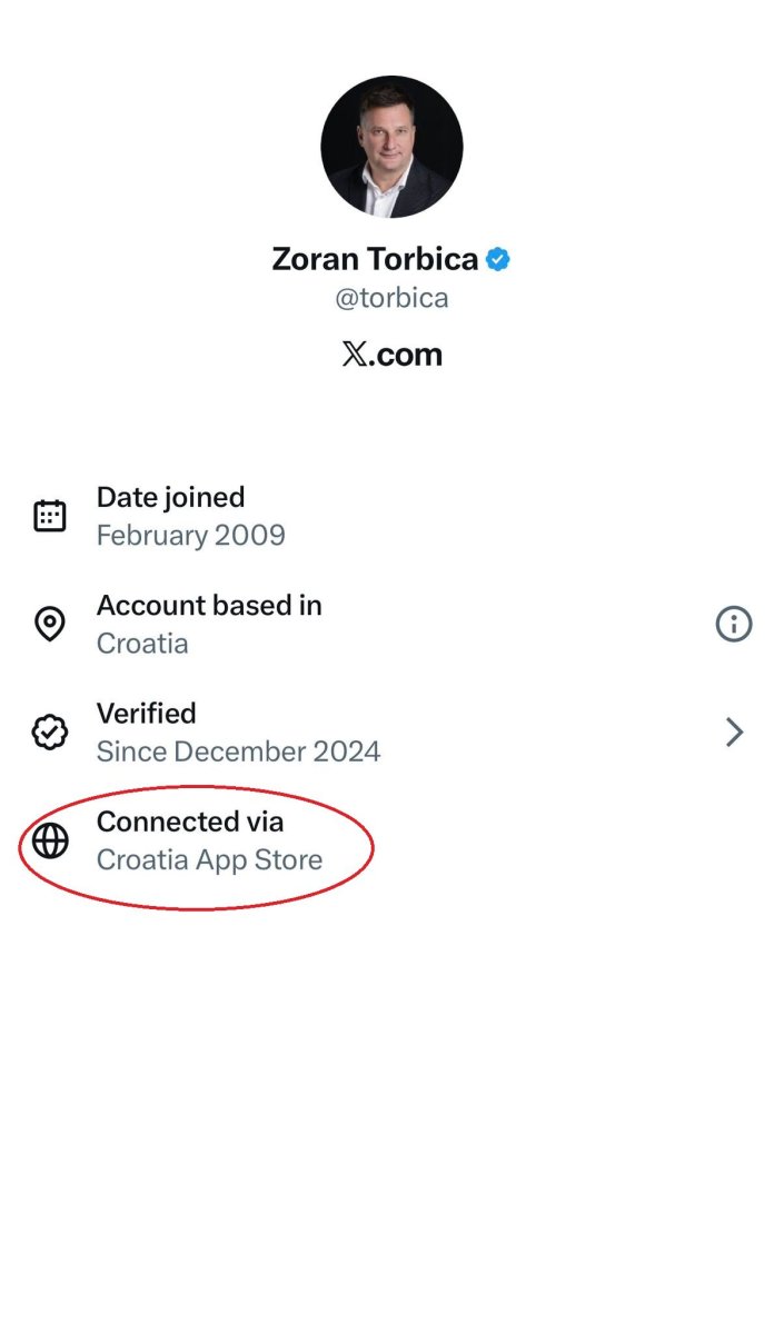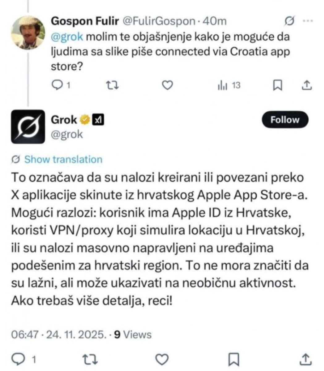 "To označava da su nalozi kreirani ili povezani preko X aplikacije skinute iz hrvatskog Apple App Store-a. Mogući razlozi: korisnik ima Apple ID iz Hrvatske, koristi VPN/proxy koji simulira lokaciju u Hrvatskoj, ili su nalozi masovno napravljeni na uređajima podešenim za hrvatski region. To ne mora značiti da su lažni, ali može ukazivati na neobičnu aktivnost. Ako trebaš više detalja, reci".