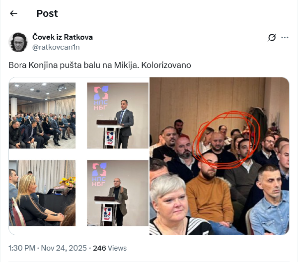 - Bora Konjina pušta balu na Mikija. Kolorizovano - napisao je Babić, na Iksu Čovek iz Ratkova, uz fotografije na kojima se u publici tokom konferencije NPS vidi upravo Antić, to jest Bora Konj.