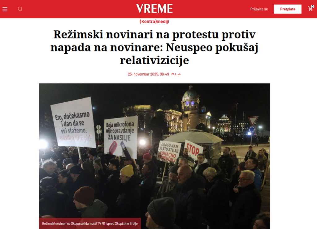 Hajku je nastavio i tajkunski nedeljnik Vreme, koji je objavio sraman tekst sa još sramnijim naslovom: "Režimski novinari na protestu protiv napada na novinare: Neuspeo pokušaj relazivizacije".