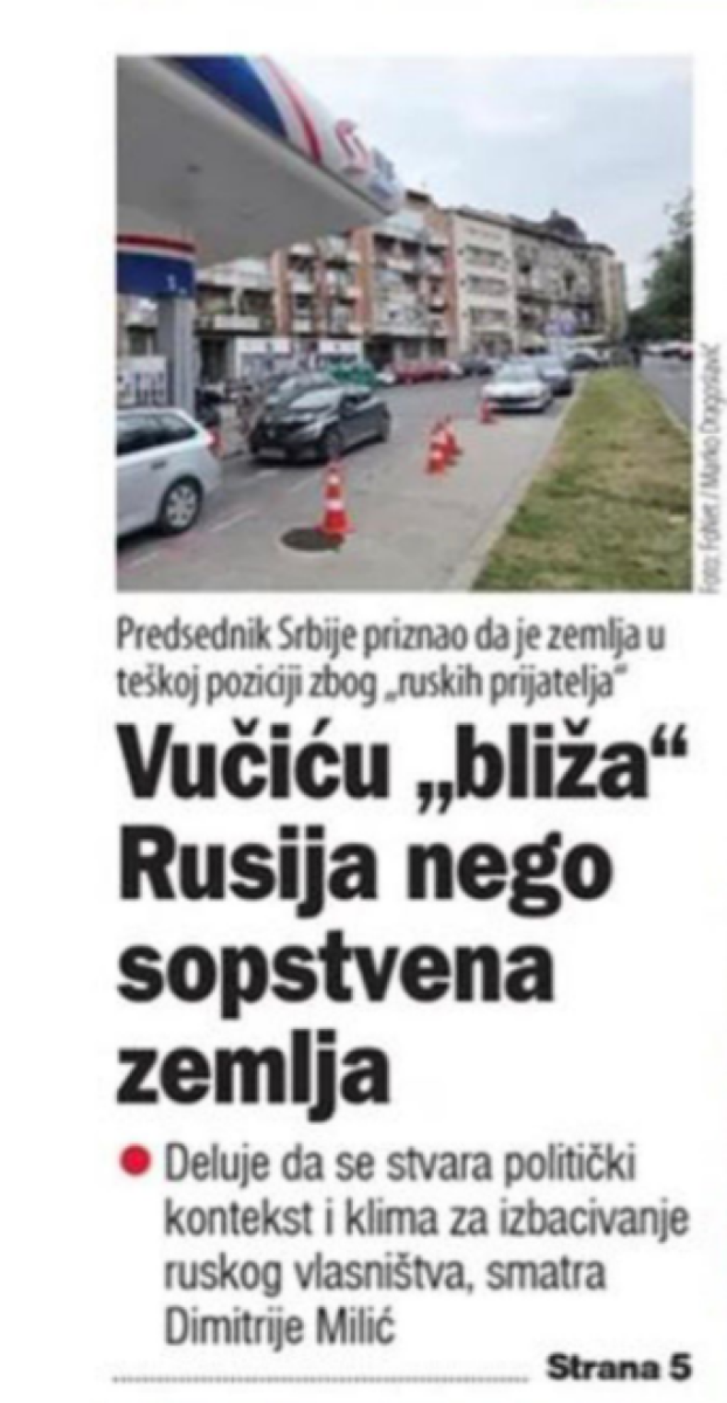 Upravo na to ukazuje tekst iz niskotiražnog tajkunskog Danasa, koji je objavljen s naslovom "Vučiću "bliža" Rusija nego sopstvena zemlja", u kom se na ironičan način lider naše zemlje optužuje da igra dvostruku igru. Sagovornik Danasa, izvesni Dimitrije Milić, programski direktor organizacije "Novi treći put" i redovni sagovornik tajkunskih medija za svaku temu za koju im ustreba potvrda njihove teze, tvrdi kako se u našoj zemlji "stvara klima za izbacivanje ruskog vlasništva".