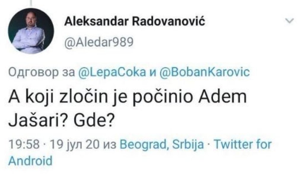 - A koji zločin je počinio Adem Jašari? Gde? - pitao se on na društvenoj mreži Iks, anulirarajući tako sva zverstva osvedočenog teroriste i ubice Srba.