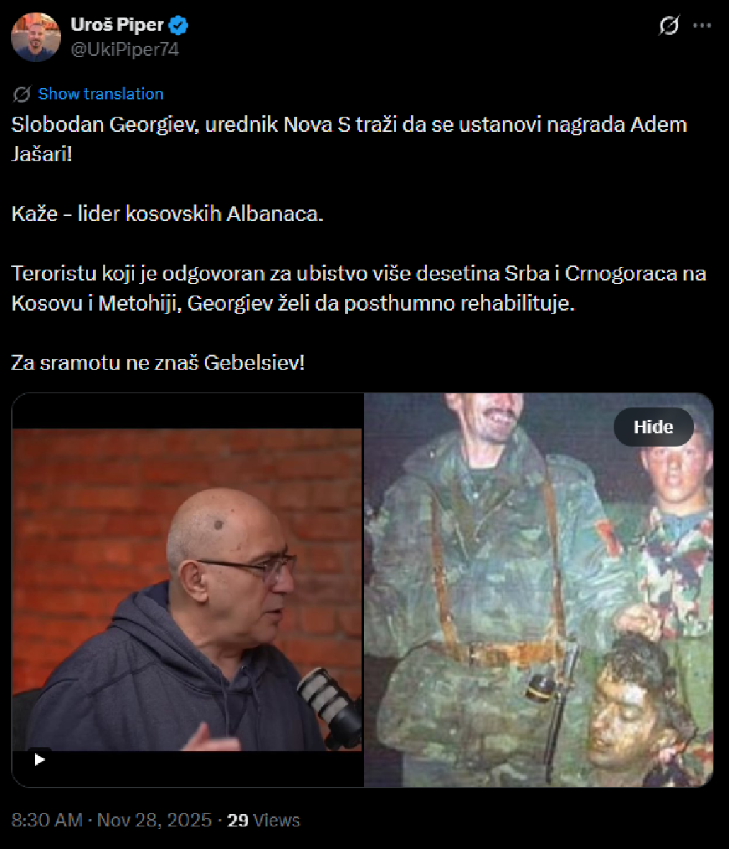 - Slobodan Georgiev, urednik "Nova S" traži da se ustanovi nagrada Adem Jašari! Kaže - lider kosovskih Albanaca. Teroristu koji je odgovoran za ubistvo više desetina Srba i Crnogoraca na Kosovu i Metohiji, Georgiev želi da posthumno rehabilituje. Za sramotu ne znaš Gebelsiev! - napisao je Piper na svom zvaničnom Iks profilu.