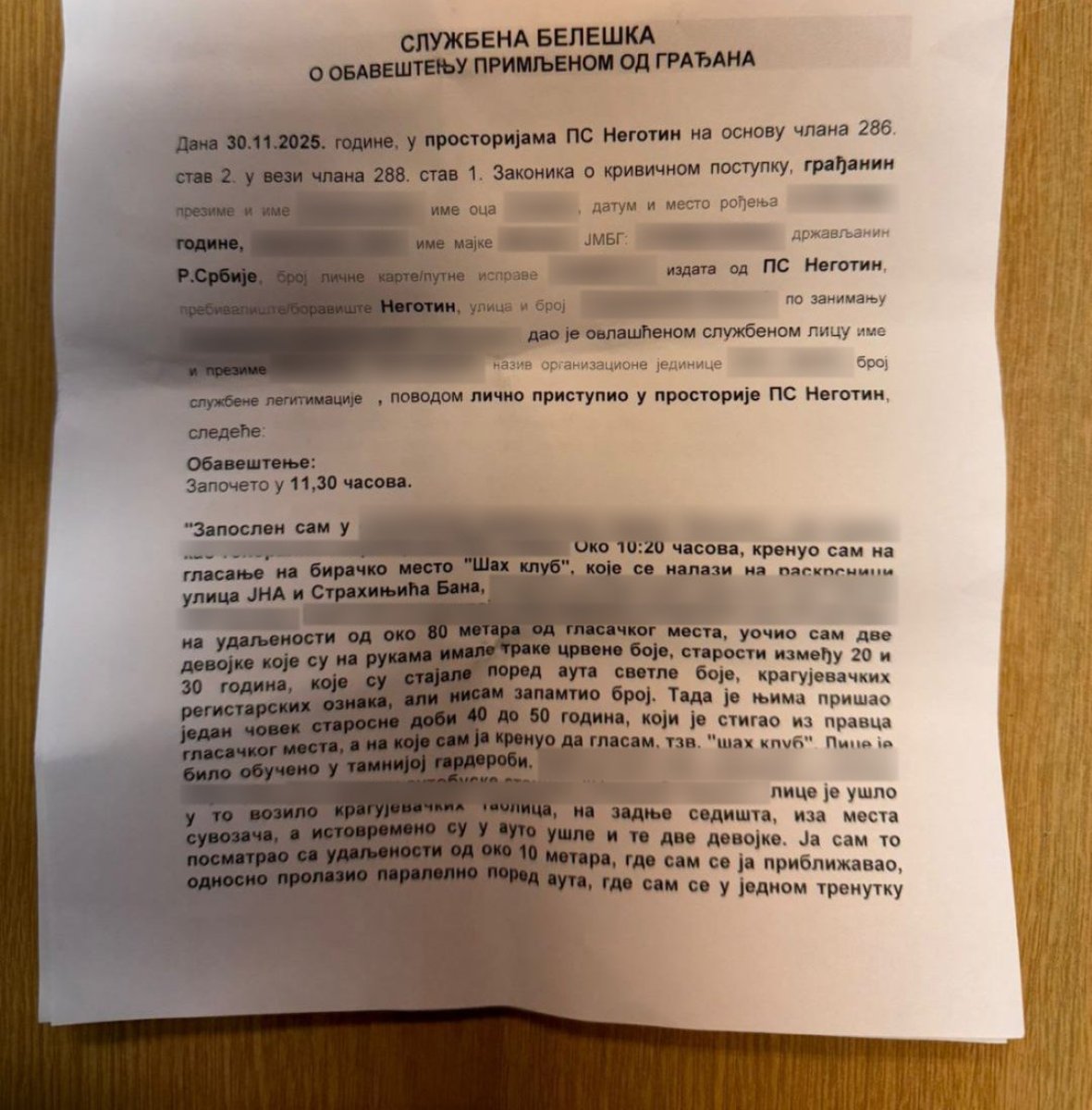 Naime, beleška je nastala nakon što je jedan građanin Negotina prijavio sumnjive aktivnosti na putu ka svom biračkom mestu. Kako je otkrio, odmah je shvatio da se dešava nešto neobično kada je naišao na dve mlađe ženske osobe koje su na rukama imale crvene trake, a nakon onoga što je video u jednom automobilu, odlučio je da slučaj prijavi policiji.