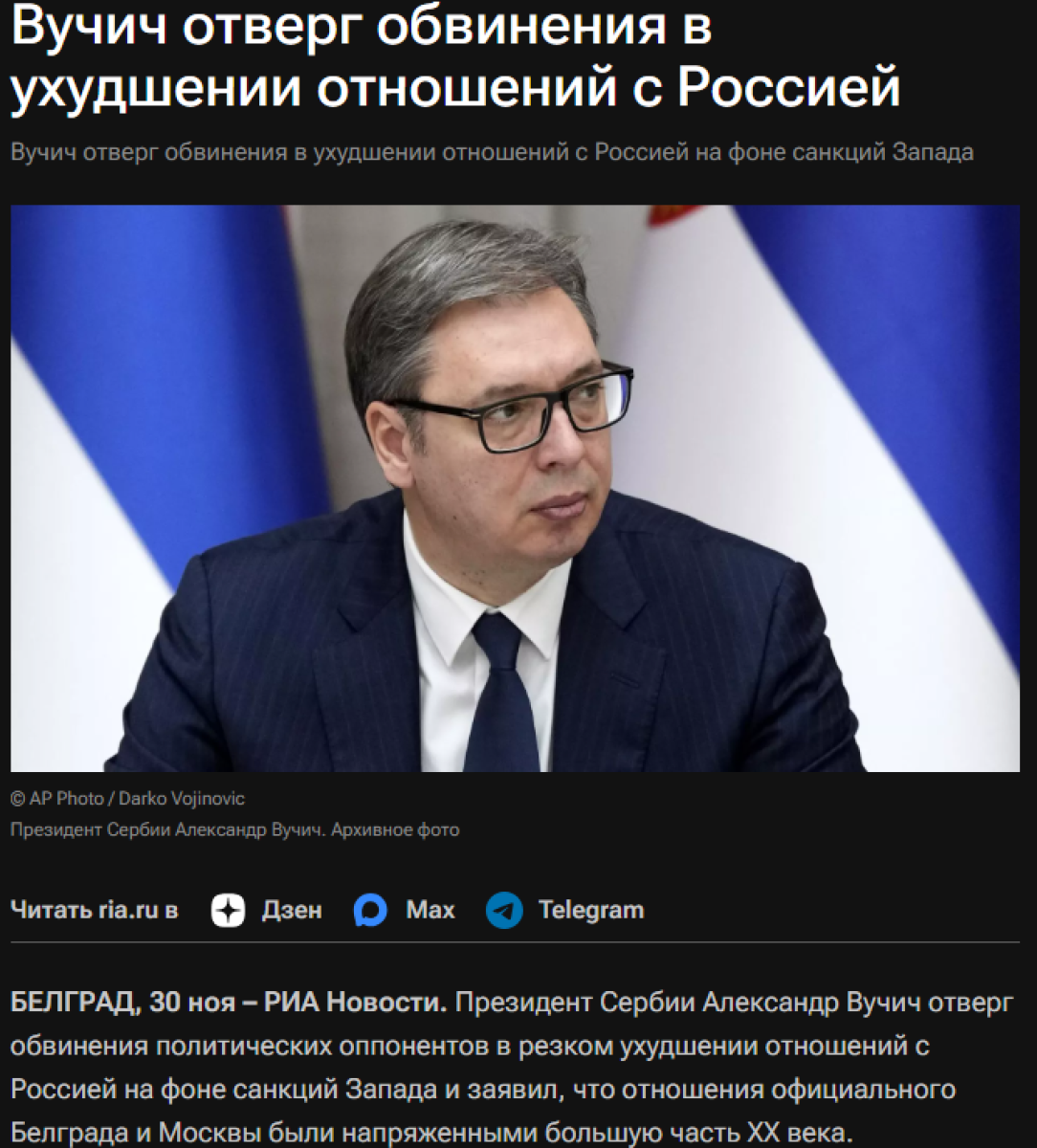 Vodeći ruski mediji preneli su večeras izjavu predsednika Srbije Aleksandra Vučića, datu ekskluzivno za TV Informer, u kojoj je oštro odbacio optužbe dela opozicije da zvanični Beograd „ruši odnose s Moskvom“ zbog pritisaka Zapada.