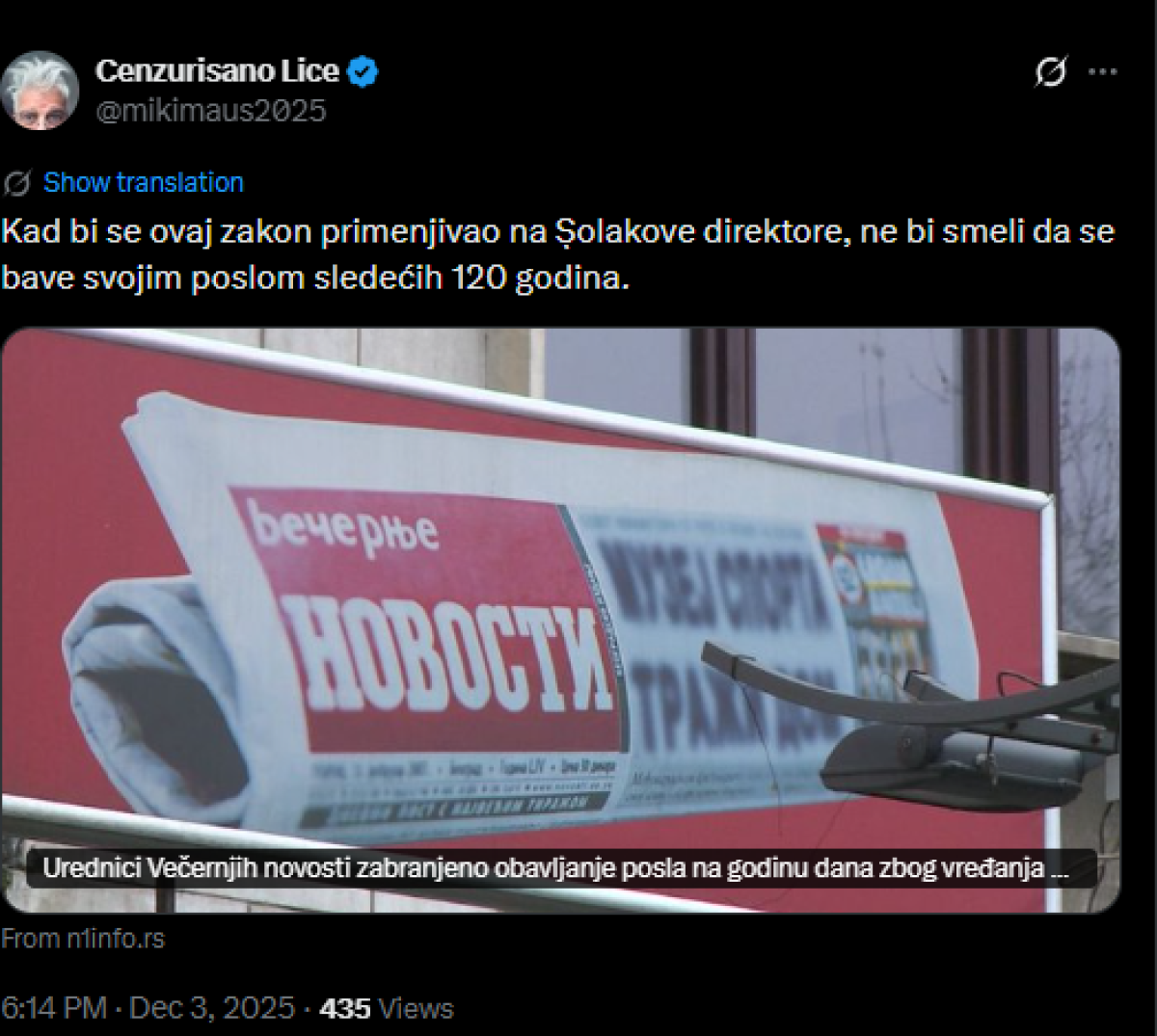 Ističe da drakonska kazna izrečena urednici „Novosti“, Andrijani Nešić, i zabrana obavljanja uredničke funkcije na godinu dana, nisu samo pravno problematične – one su duboko opasne za celokupan medijski prostor u Srbiji. Takvim odlukama se šalje zastrašujuća poruka novinarima da će, umesto da budu zaštićeni u svom radu, biti sankcionisani ako nisu „po meri“ onih koji bi trebalo da pravedno i nepristrasno sude.