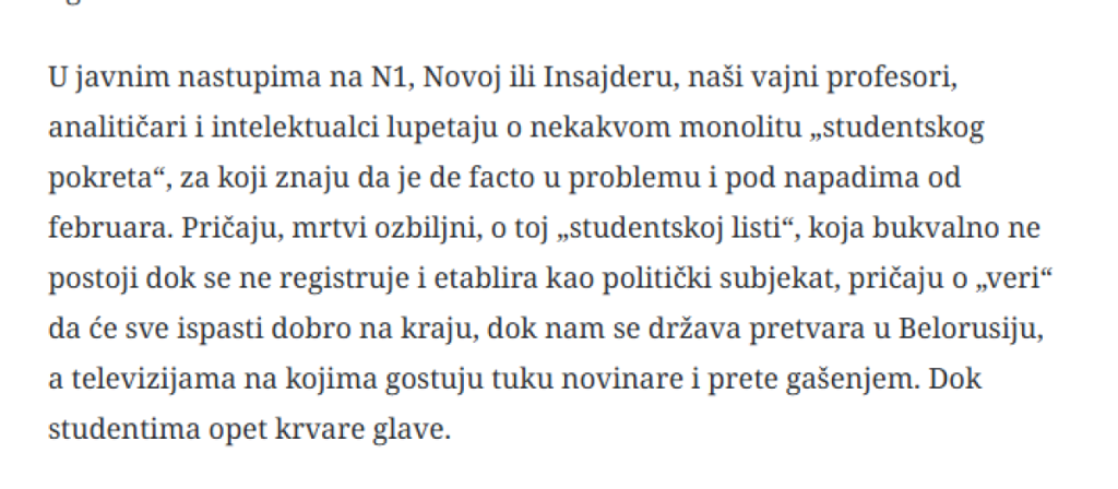 - Dakle, intelektualci i profesori su dobili svoje plate nazad, i sad neki rade projekte, žongliraju grantovima, putuju po svetu (kad im je baš teško), piju vina i gledaju studente, koji padaju ničice, jedan po jedan, boreći se kao gladijatori u svom Matriksu. Gledaju ih kao da gledaju fudbalsku utakmicu - piše između ostalog Filipović.