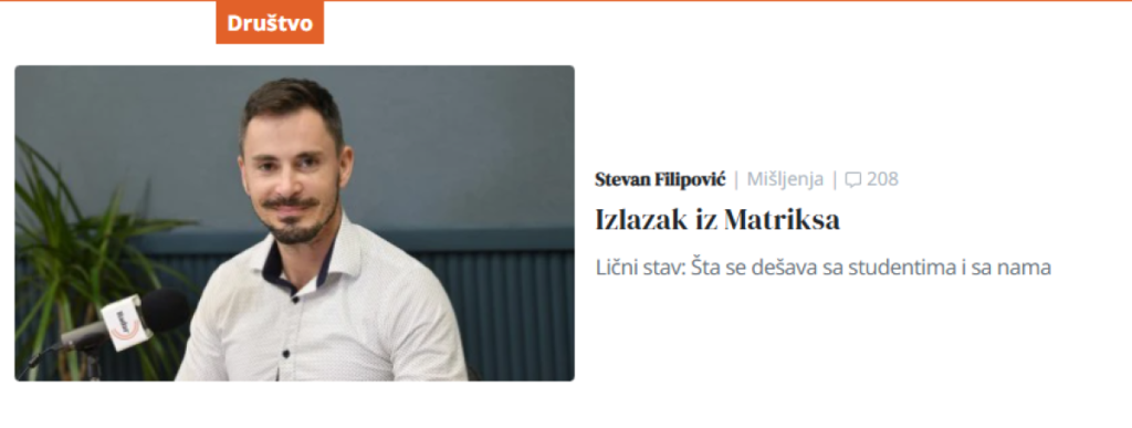 U tekstu pod naslovom "Izlazak i Matriksa", Filipović se ogradio od takozvane "studentske liste" posebno napadajući intelektualce i profesore i optužujući ih za izdaju.