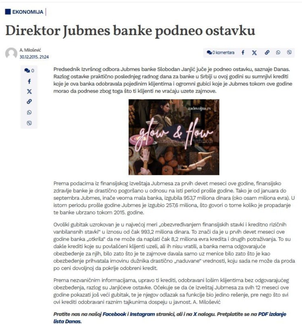 Prema tekstu koji je 2015. objavio tajkunski "Danas", Slobodan Janjić se pre deset godina povukao sa funkcije predsednika izvršnog odbora Jubmes banke - a razlog ostavke su sumnjivi krediti koje je ova banka odobravala pojedinim klijentima i ogromni gubici koje je Jubmes tokom te godine morao da podnese zbog toga što ti klijenti ne vraćaju uzete zajmove.