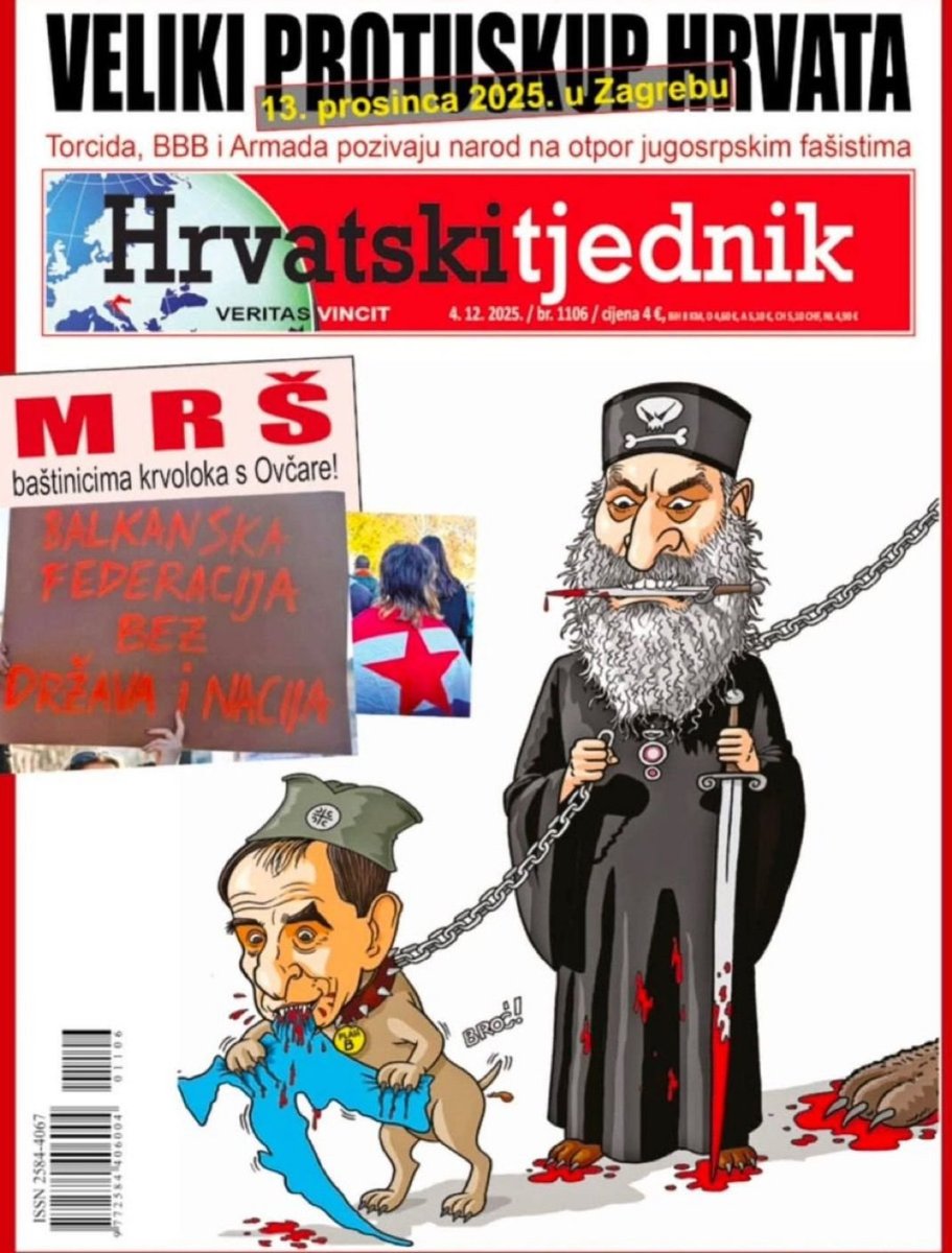 Na naslovnoj strani "Hrvatskog tjednika" pojavila se skandalozna karikatura koja, čini se, prikazuje patrijarha SPC Porfirija sa krvavim nožem među zubima, uz poziv na veliki skup otpora "jugosrpskim fašistima".