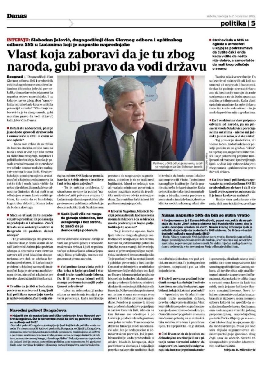 Nekadašnji dugogodišnji član Glavnog odbora i opštinskog odbora Srpske napredne stranke u Lučanima Slobodan Jolović napao je, preko opozicionih medija, vlast čiji je deo i sam donedavno bio.