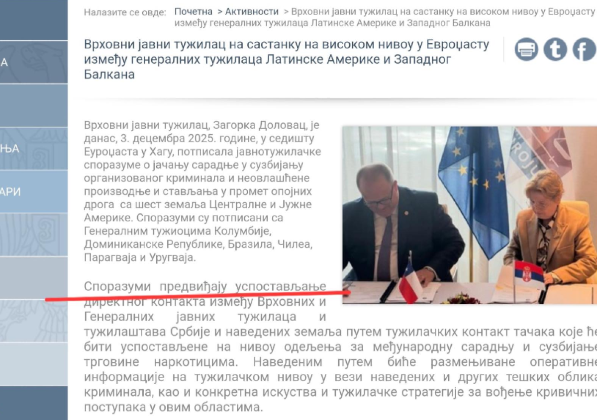 "Vrhovni javni tužilac, Zagorka Dolovac, je danas, 3. decembra 2025. godine, u sedištu Eurodžasta u Hagu, potpisala javnotužilačke sporazume o jačanju saradnje u suzbijanju organizovanog kriminala i neovlašćene proizvodnje i stavljanja u promet opojnih droga sa šest zemalja Centralne i Južne Amerike. Sporazumi su potpisani sa Generalnim tužiocima Kolumbije, Dominikanske Republike, Brazila, Čilea, Paragvaja i Urugvaja."