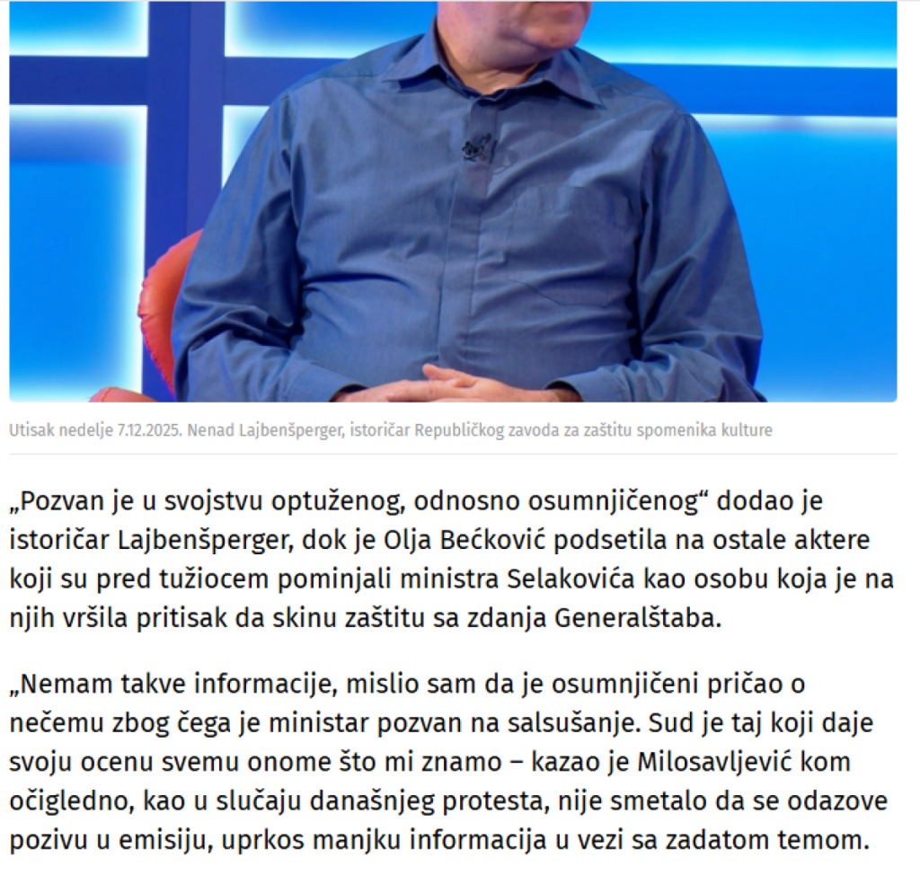 Naime, njemu se najpre obratio drugi gost u emisiji, istoričar Nenad Lajbenšperger, rečima kako je Selaković "pozvan je u svojstvu optuženog".