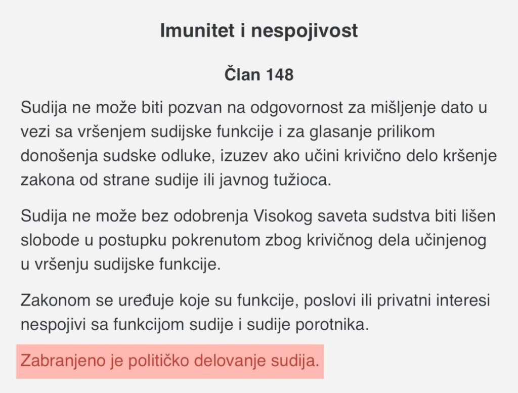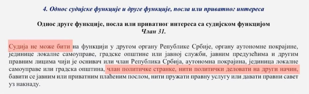 Član 148. Ustava jasno kaže "Zabranjeno je političko delovanje sudija" - dok Zakon o sudijama, Član 31, nalaže da: "Sudija ne može biti na funkciji u drugom organu Republike Srbije, organu autonomne pokrajine, jedinice lokalne samouprave, gradske opštine ili javnoj službi, javnim preduzećima i drugim pravnim licima čiji je osnivač ili član Republike Srbije, autonomna pokrajina, jedinica lokalne samouprave ili gradska opština, član političke stranke, niti politički delovati na drugi način, baviti se javnim ili privatnim plaćenim poslom, niti pružati pravnu uslugu ili davati pravni savet uz naknadu".