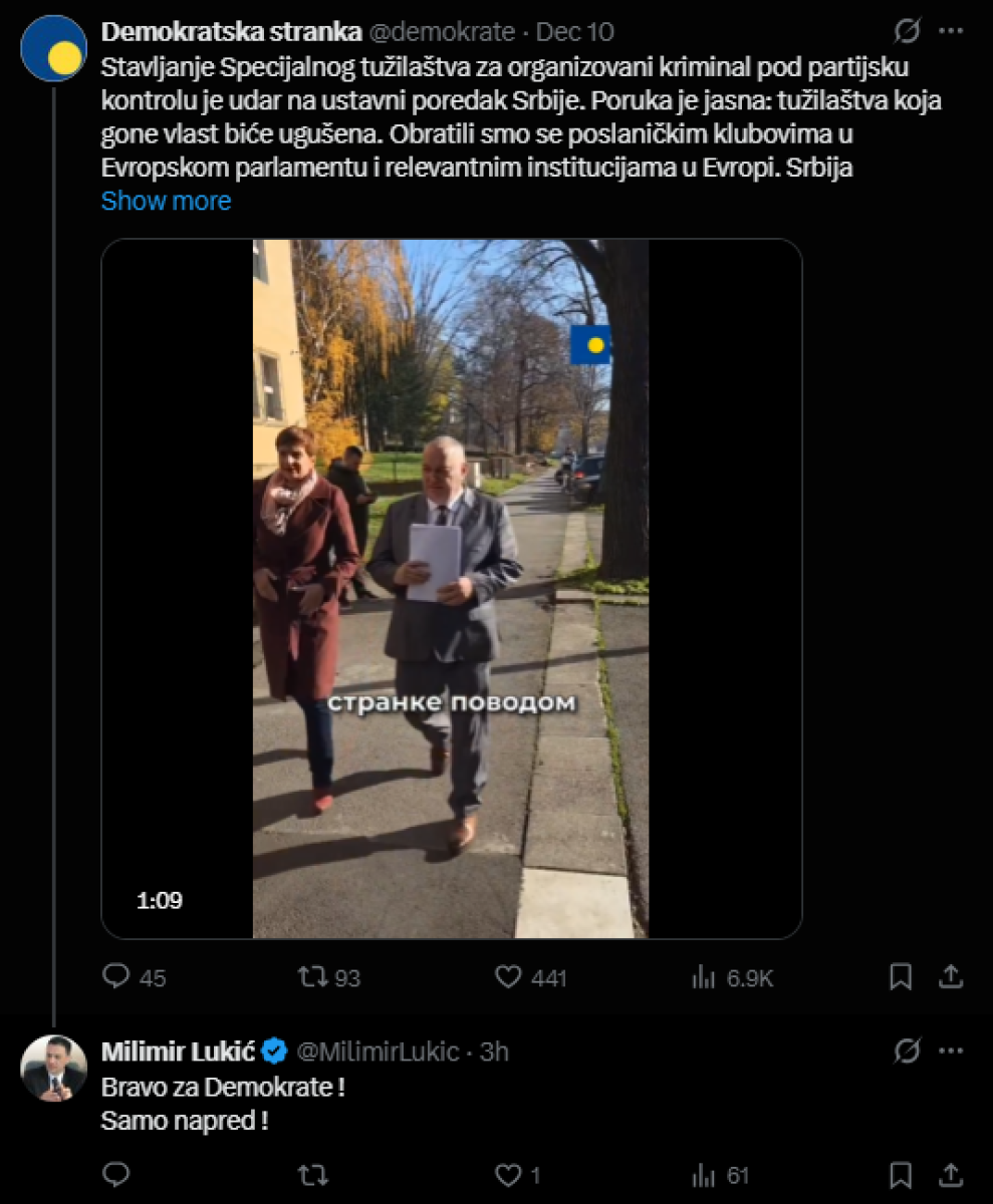 Sudija Apelacionog suda u Beogradu Milimir Lukić na svom Iks nalogu podržava blokadere, koji bi da sruše Srbiju. Podržao je grupu blokaderskih sudija i tužilaca, koji su se 7. decembra okupili ispred Ustavnog suda u Beogradu. Na tom skupu su bila poznata lica - lica blokaderskih sudija i tužilaca koji se bore da na slobodi budu nasilnici i ljudi koji žele da sruše Srbiju i svakodnevno prete predsedniku Srbije Aleksandru Vučiću i njegovoj porodici.