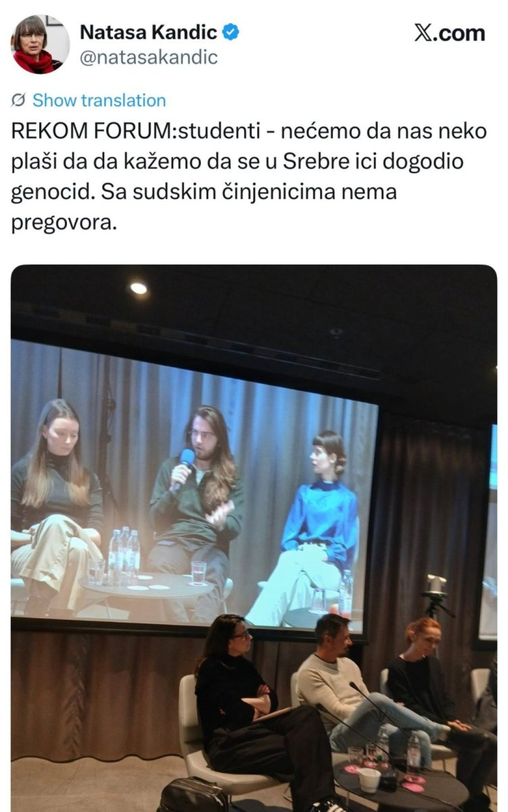 - Rekom forum: Studenti - nećemo da nas neko plaši da kažemo da se u Srebrenici dogodio genocid. Sa sudskim činjenicama nema pregovora - napisala je ova antisrpkinja na Iksu.