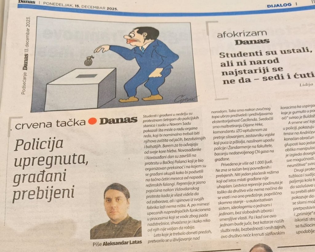 - Represija je jasno pojačana nakon Vidovdanskog protesta kada je vlast videla da od zaborava, ali i spinova iz svojih fabrika laži nema ništa. A po mimezi upecanih naprednjačkih funkcionera u procesima koji se vode zbog pada nadstrešnice, shvaćeno je i kako niko od njih nije voljan da robija - piše Latas u tekstu u kom optužuje vlast i policiju za represiju, a ne spominje užasno nasilje u režiji blokadera koje je prethodnih 12 meseci, posebno tokom leta, viđeno na ulicama gradova širom Srbije.