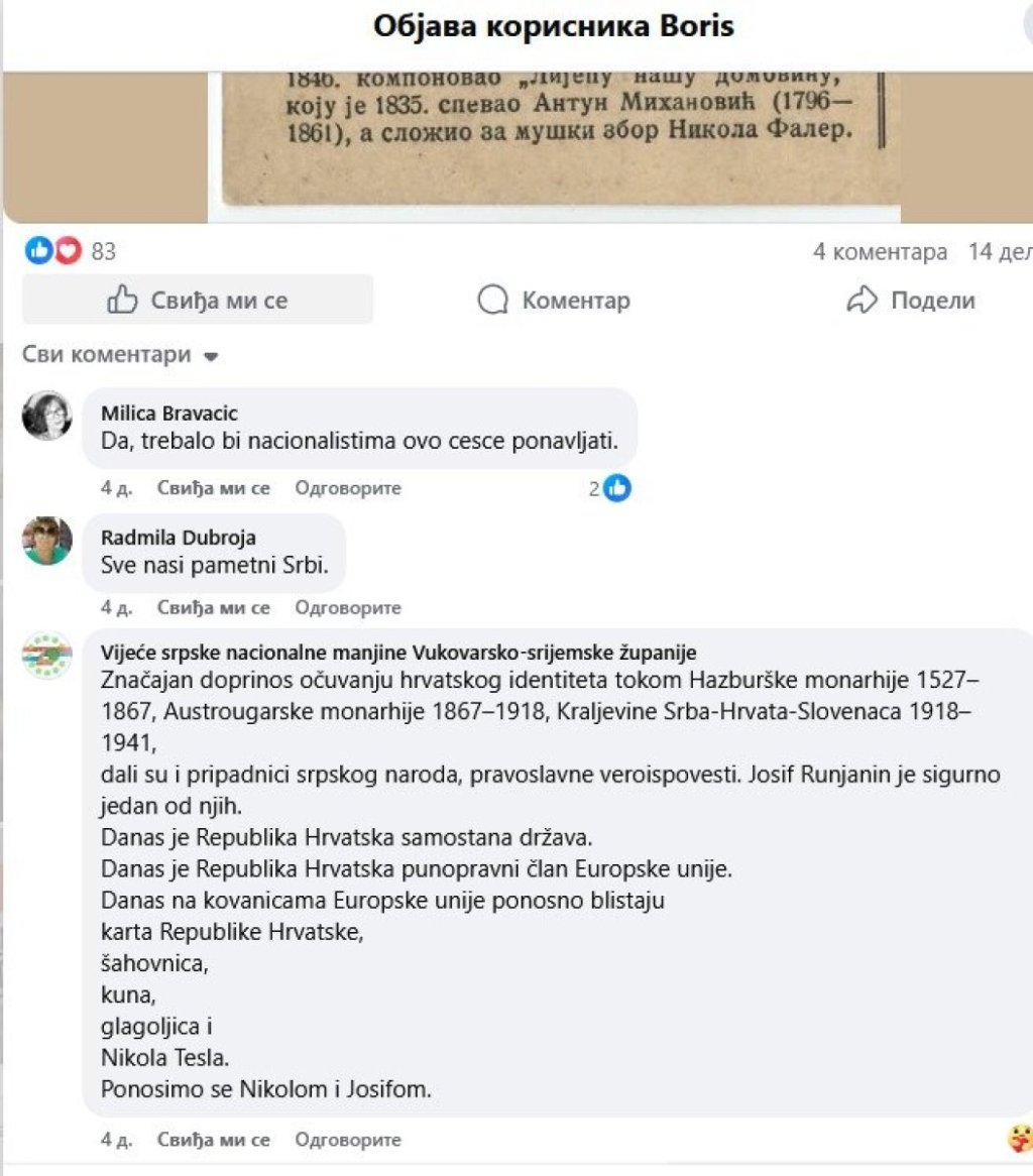 - Ovo je otvoreno guranje Srba u pravcu identitetskog izjednačavanja i gura ih u asimilaciju. Posebno je skandalozno što je komentar Latasa u potpunoj suprotnosti sa kulturnom politikom Srbije u regionu, plasiran na zvaničnom portalu Veća srpske nacionalne manjine Vukovarsko sremske županije, i to od strane sekretara ovog organa - istaknuto je iz Srpske organizacije u Hrvatskoj.