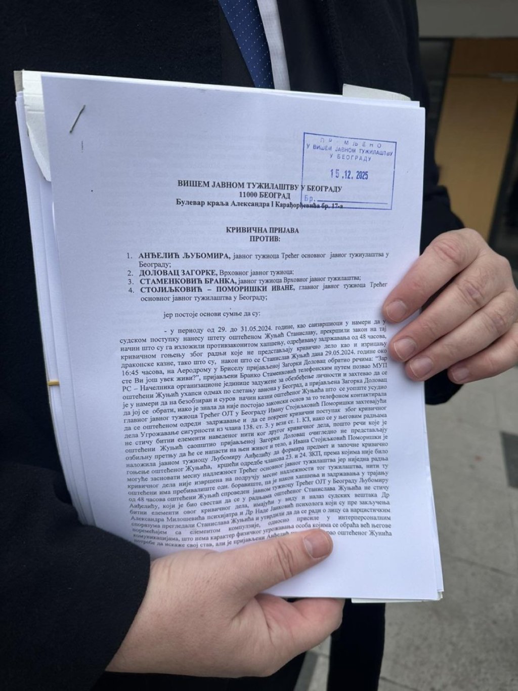 Prema navodima krivične prijave, u koju je naša redakcija imala uvid, postoje osnovi sumnje da su u periodu od 29. do 31. maja 2024. godine, pomenuti tužioci kao saizvršioci "prekršili zakon tako što su S. Ž. izložili protivzakonitom hapšenju, određivanju zadržavanja od 48 časova, krivičnom gonjenju zbog radnji koje ne predstavljaju krivično delo, kao i izricanju drakonske kazne".