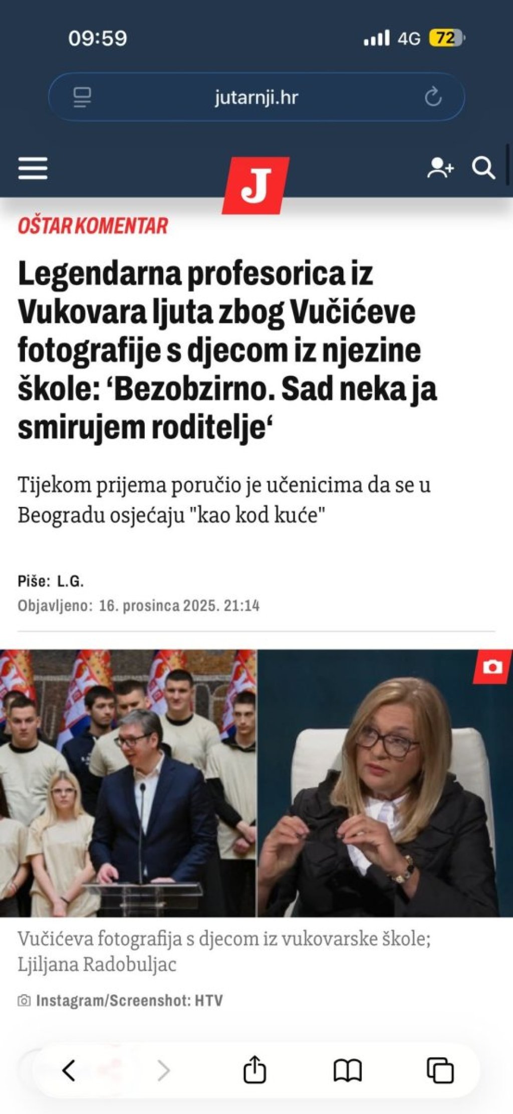 - Dok njihovi vršnjaci već godinu dana nemaju normalnu nastavu, dok hodaju i pešače Srbijom kako bi ukazali na bezakonje, protivustavnost i težak položaj mislećih ljudi, dok moje kolege u Srbiji stenju pod teretom ludila, otkaza i pretnji, neko odluči da odvede učenike moje škole na prijem istom tom Vučiću - zakukala je Radobuljac, što su, brže-bolje, dočekali ustaški mediji u Hrvatskoj koji su njene izjave iskoristili da dodatno napadnu predsednika Vučića.