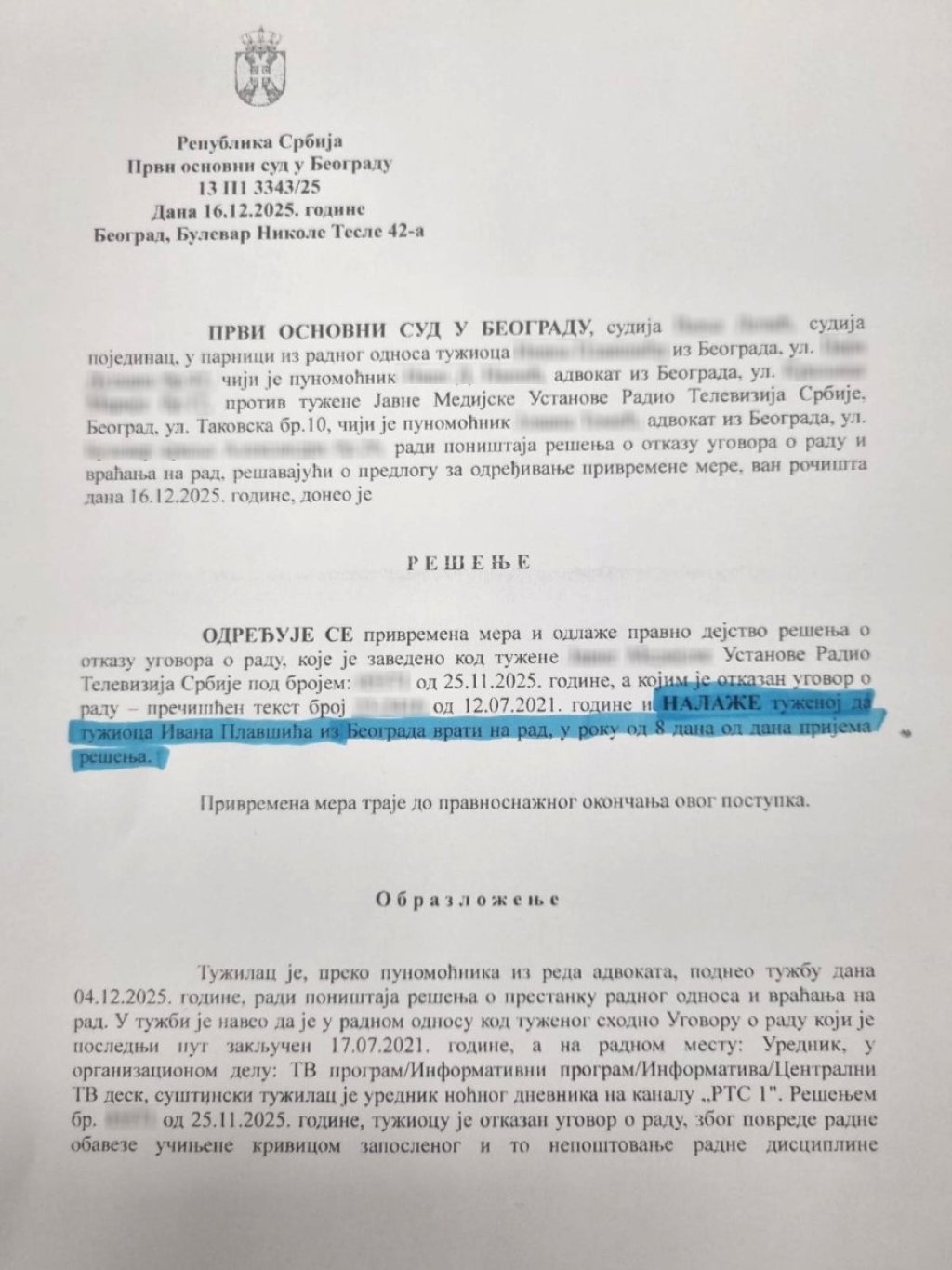 Uprkos tome, rešenjem koje je doneo Prvi osnovni sud u Beogradu "određuje se privremena mera i odlaže pravno dejstvo rešenja o otkazu ugovora o radu, koje je zavedeno kod tužene Javne medijske ustanove Radio-televozije Srbije i nalaže tuženoj da tužioca Ivana Plavšića iz Beograda vrati na rad, u roku od 8 dana od dana prijema rešenja".