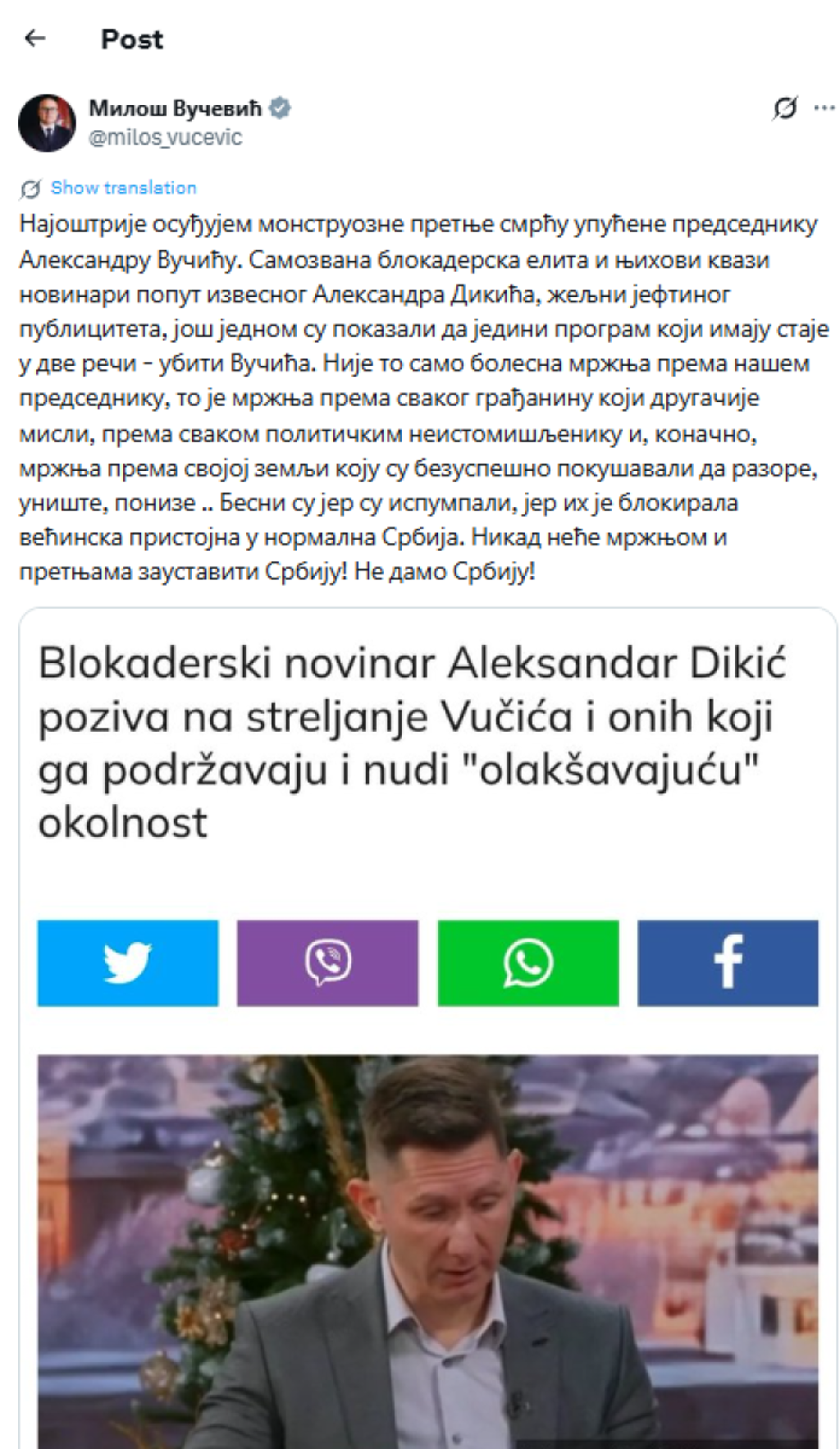 - Samozvana blokaderska elita i njihovi kvazinovinari poput izvesnog Aleksandra Dikića, željni jeftinog publiciteta, još jednom su pokazali da jedini program koji imaju staje u dve reči - ubiti Vučića - istakao je Vučević na društvenoj mreži Iks.