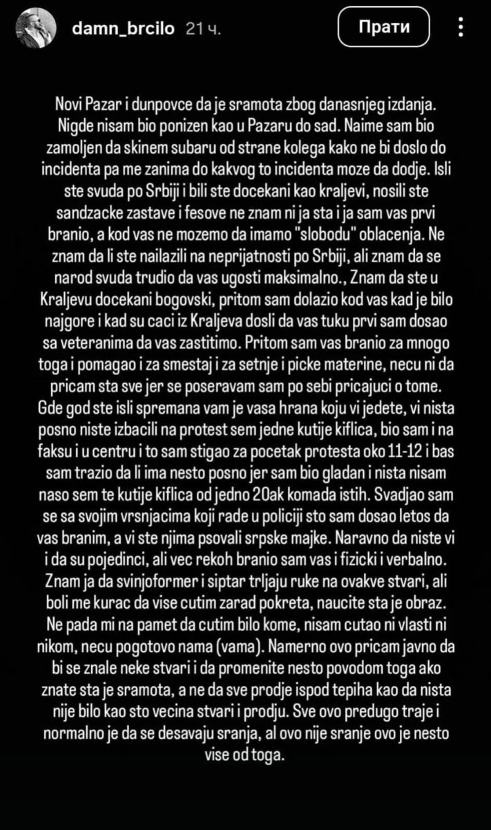 - Nigde nisam bio ponižen kao u Pazaru do sad. Naime, bio sam zamoljen da skinem šubaru od strane kolega kako ne bi došlo do incidenta, pa me zanima do kakvog to incidenta može da dođe. Išli ste svuda po Srbiji i bili ste dočekani kao kraljevi, nosili ste sandžačke zastave i fesove, ne znam ni ja šta, i ja sam vas prvi branio, a kod vas ne možemo da imamo "slobodu" oblačenja - poručio je on u objavi na Instagramu juče.