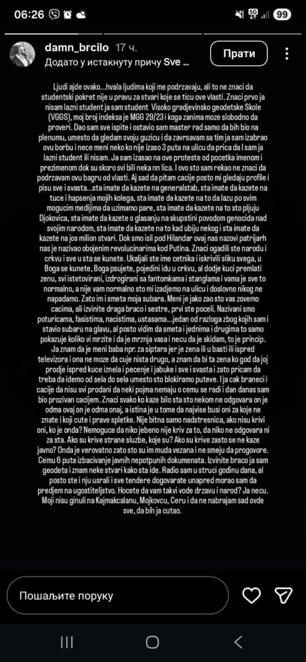 - Prvo, ja nisam lažni student, ja sam student Visoko građevinsko geodetske škole (VGGS), koga zanima može slobodno da proveri. Dao sam sve ispite i ostavio sam master rad samo da bih bio na plenumu, umesto da gledam svoju gu*icu i da završavam sa tim, ja sam izabrao ovu borbu. I neće meni neko ko nije izašao tri puta na ulicu da priča da l sam ja lažni student ili nisam - požalio se očajni blokader.