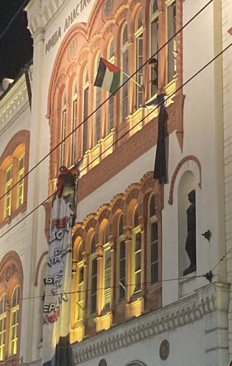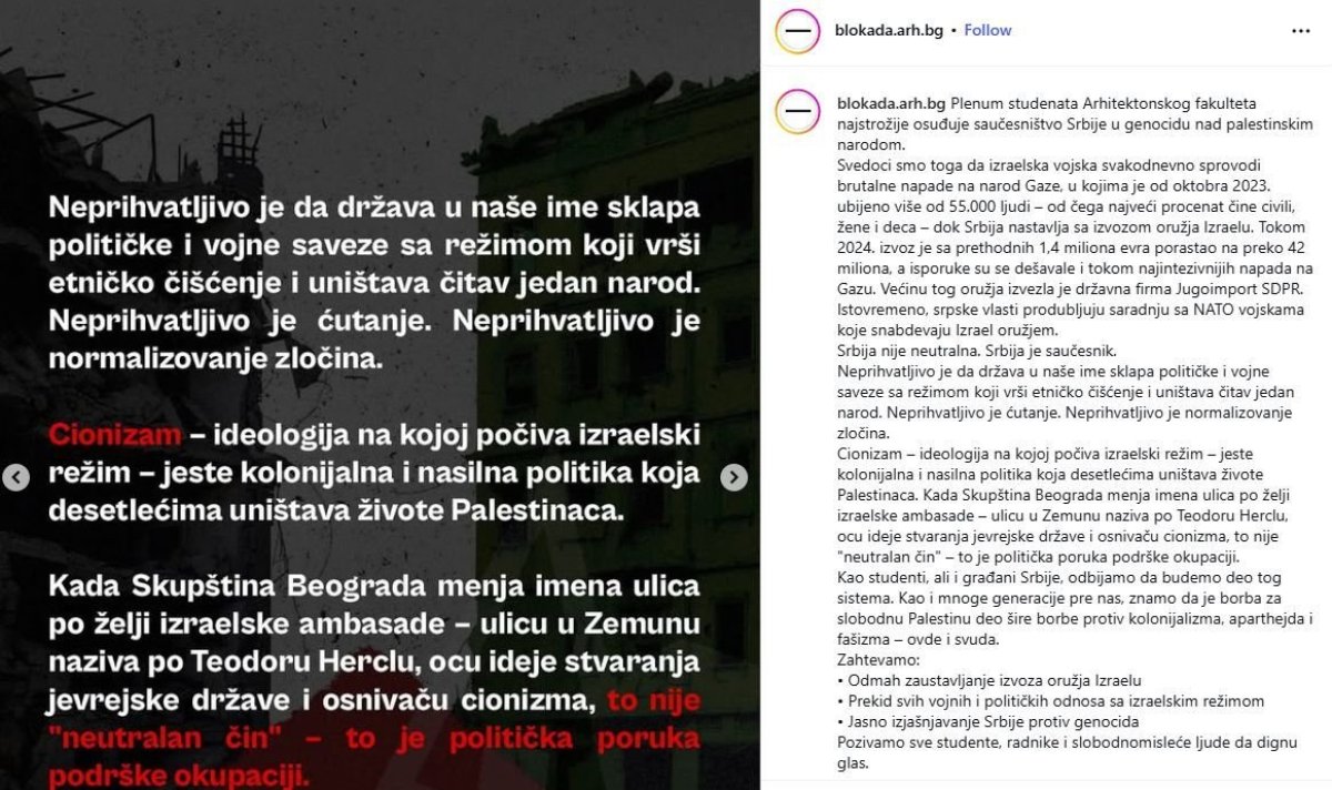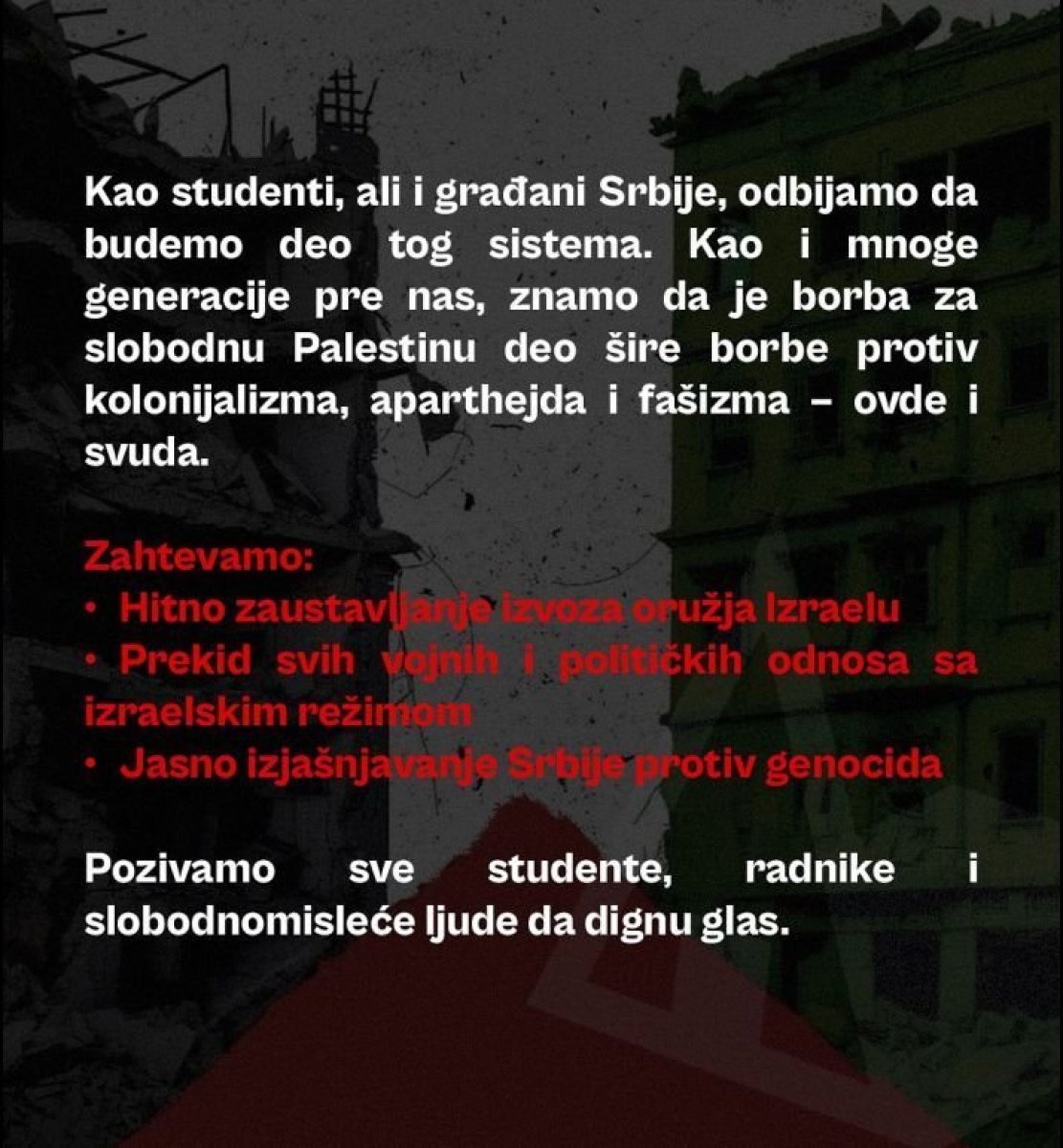 Cionizam – ideologija na kojoj počiva izraelski režim – jeste kolonijalna i nasilna politika koja desetlećima uništava živote Palestinaca. Kada Skupština Beograda menja imena ulica po želji izraelske ambasade – ulicu u Zemunu naziva po Teodoru Herclu, ocu ideje stvaranja jevrejske države i osnivaču cionizma, to nije „neutralan čin“ – to je politička poruka podrške okupaciji. ... Kao i mnoge generacije pre nas, znamo da je borba za slobodnu Palestinu deo šire borbe protiv kolonijalizma, aparthejda i fašizma – ovde i svuda. Zahtevamo: Prekid svih vojnih i političkih odnosa sa izraelskim režimom. Jasno izražavanje Srbije protiv genocida. Pozivamo sve studente, radnike i slobodnomisleće ljude da dignu glas.
