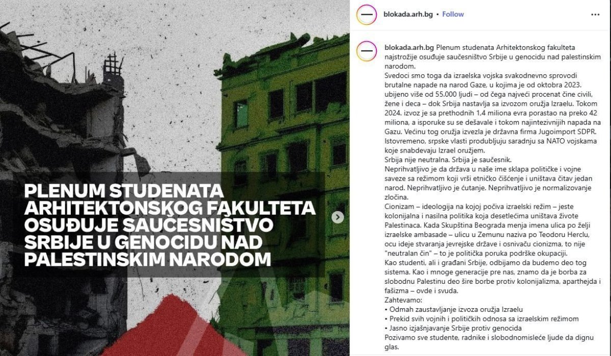 Plenum studenata Arhitektonskog fakulteta govori o tome da je borba za slobodnu Palestinu deo šire borbe protiv kolonijalizma, aparthejda i fašizma – ovde i svuda. Plenum zapravo govori o globalizaciji te borbe, ovde – u Srbiji i svuda – na svetskom nivou, npr. u Australiji. Da li ćemo uskoro ovde u Srbiji slušati i parole o globalizaciji intifade koje se uveliko koriste svuda na drugim mestima? Studenti ovog fakulteta pišu u nastavku – Zahtevamo: Prekid svih vojnih i političkih odnosa sa izraelskim režimom. Jasno izražavanje Srbije protiv genocida.
