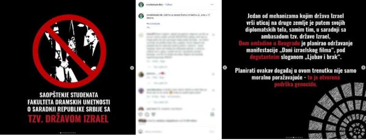 Jedan od mehanizama kojim država Izrael vrši uticaj na druge zemlje je putem svojih diplomatskih tela, samim tim, u saradnji sa ambasadom tzv. Države Izrael, Dom omladine u Beogradu je planirao održavanje manifestacije „Dani izraelskog filma“, pod degutantnim sloganom „Ljubav i brak“. Planirati ovakav događaj u ovom trenutku nije samo moralno poražavajuće – to je otvorena podrška genocidu.