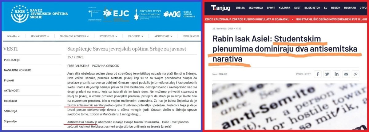 Predsednik Radnog odbora Saveza jevrejskih opština Srbije (SJOS), rabin Srbije, gospodin Isak Asiel je objavio 25.12.2025. godine, autorski tekst, saopštenje, u ime Saveza jevrejskih opština Srbije, na sajtu tog Saveza. Tekst rabina Isaka Asijela ima naslov "FREE PALESTINE – POZIV NA GENOCID". Rabin Srbije, gospodin Isak Asiel ukazuje da je u svetu, "antisemitski narativ postao opšte društveno prihvatljiv i poželjan", i kritikuje jasan antisemitizam studentskih blokaderskih plenuma i prikazuje dokaze za to u obliku različitih saopštenja i objava, mnogobrojnih uticajnih plenumaških stranica- naloga, npr. plenuma studenata u blokadi Fakulteta dramskih umetnosti, plenuma studenata Arhitektonskog fakulteta u blokadi, plenuma studenata u blokadi Fakulteta primenjenih umetnosti, plenuma studenata Filozofskog fakulteta u blokadi i Instituta za filozofiju i društvenu teoriju.
