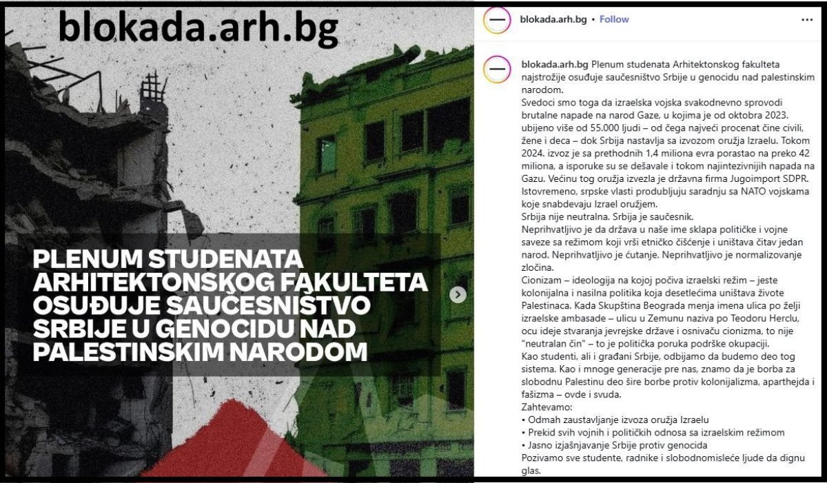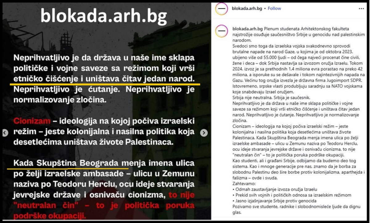 Plenum studenata Arhitektonskog fakulteta govori o tome da je borba za slobodnu Palestinu deo šire borbe protiv kolonijalizma, aparthejda i fašizma – ovde i svuda. Plenum zapravo govori o globalizaciji te borbe, ovde – u Srbiji i svuda – na svetskom nivou, npr. u Australiji. Kakav sunovrat ovog i drugih studentskih Plenuma! Slogan From the river to the sea, Palestine will be free, ili skraćeno Free Palestine odnosi se na istrebljenje Jevreja odnosno potpunu eliminaciju Izraela. To je poziv na genocid".