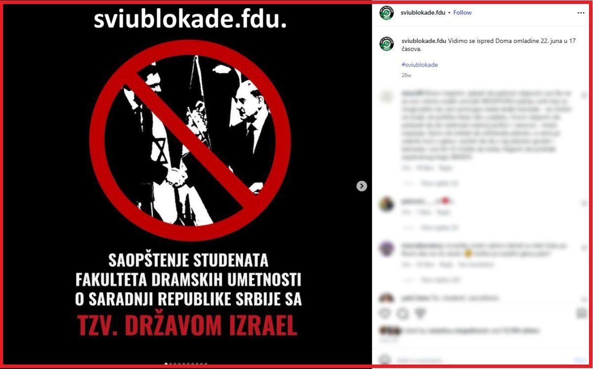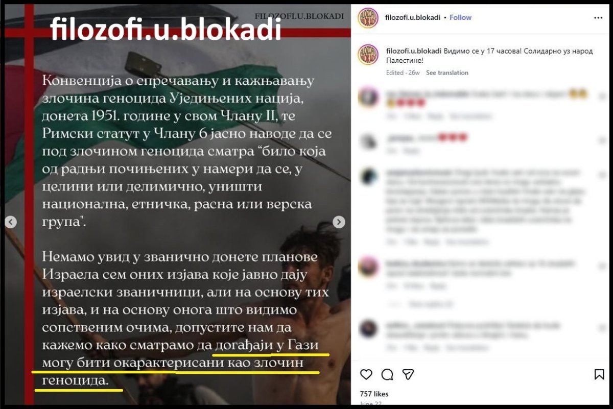 Vrhunac svega ovoga predstavlja Predlog rezolucije Narodne skupštine o situaciji u Gazi i uvođenju mera ograničavanja Republike Srbije prema državi Izrael (koju su predložli poslanici ZLF – opaska N.B.) u kojoj piše da izraelske snage u Pojasu Gaze sprovode genocid. Kada bi predlog bio usvojen, ovaj narativ na koji ukazujemo sa zebnjom, bi se odomaćio u našem društvu, a posledice bi mogle biti nesagledive.