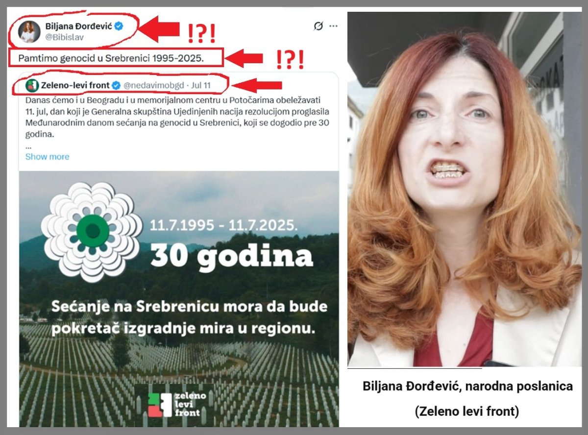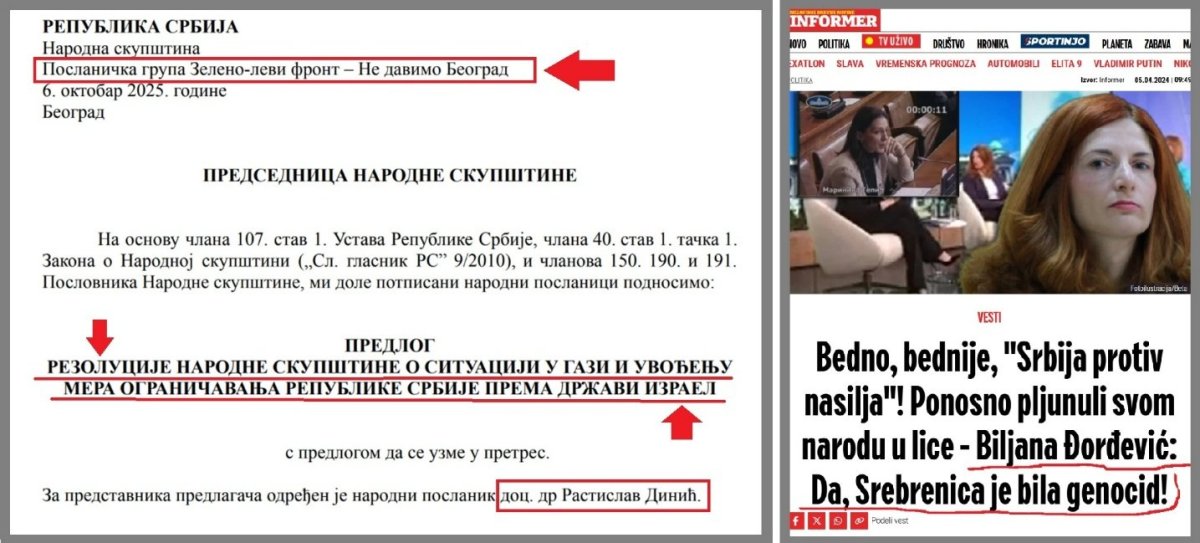 Tri političke grupe – "Studenti u blokadi", Zeleno levi front (ZLF) i Stranka demokratske akcije (SDA), osim što su antisemiti i što podržavaju teroristički Hamas, što pozivaju na istrebljenje Izraelaca, i osim što proglašavaju jevrejski narod genocidnim, poznati su i po izrazitom antisrpstvu, i po tome što Srbe optužuju da su počinili genocid u Srebrenici, i shodno tome ove tri političke grupacije i Srbe žigošu kao genocidni narod. Da li je potrebno da naglasim da ne postoji genocid u Srebrenici i Gazi.