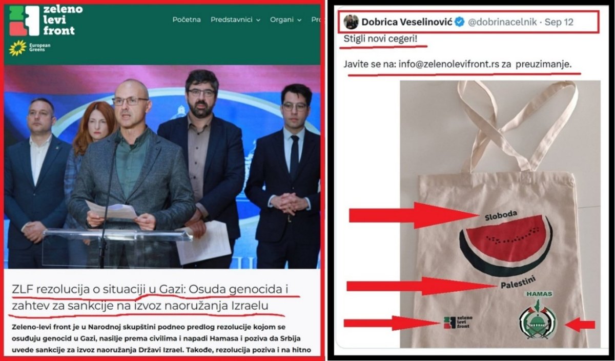 Dobrica Veselinović, poslanik ZLF je 12.09.2025. godine, na svom „X“ nalogu reklamirao poklanjanje cegera – platnenih torbi koje je nabavio ZLF, na kojima piše „Sloboda Palestini” i na kojima stoji znak Hamasa. Zeleno levi front nikada nije imao akciju i cegere – „Sloboda Srbima na KiM" ili „Sloboda Kosovu i Metohiji"! Antisrpski ZLF nema saosećanje za Srbe na KiM. Program ZLF predviđa priznanje lažne države Kosovo! ZLF ima empatiju za Palestince, ali nema za Srbe! Ne treba zaboraviti da je Dobrica Veselinović bio pripadnik neonacističke grupe skinheds i promoter rasističke grupe "Cokule".