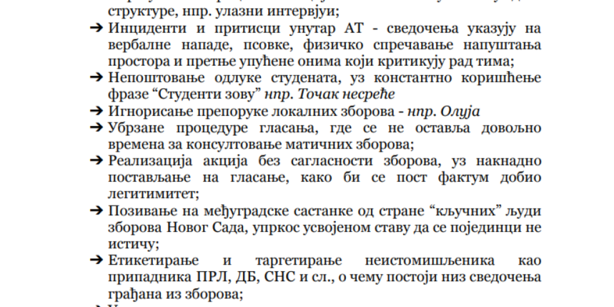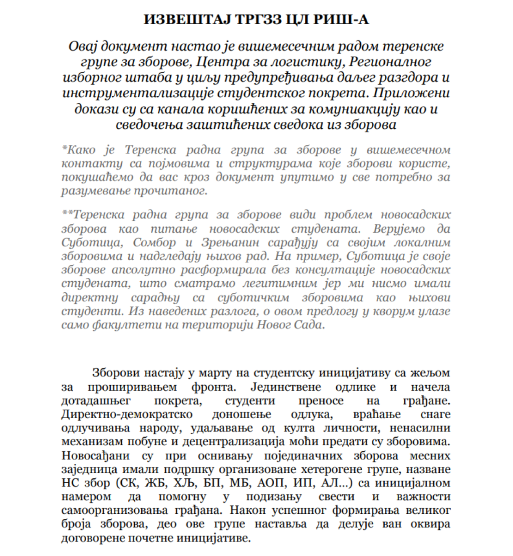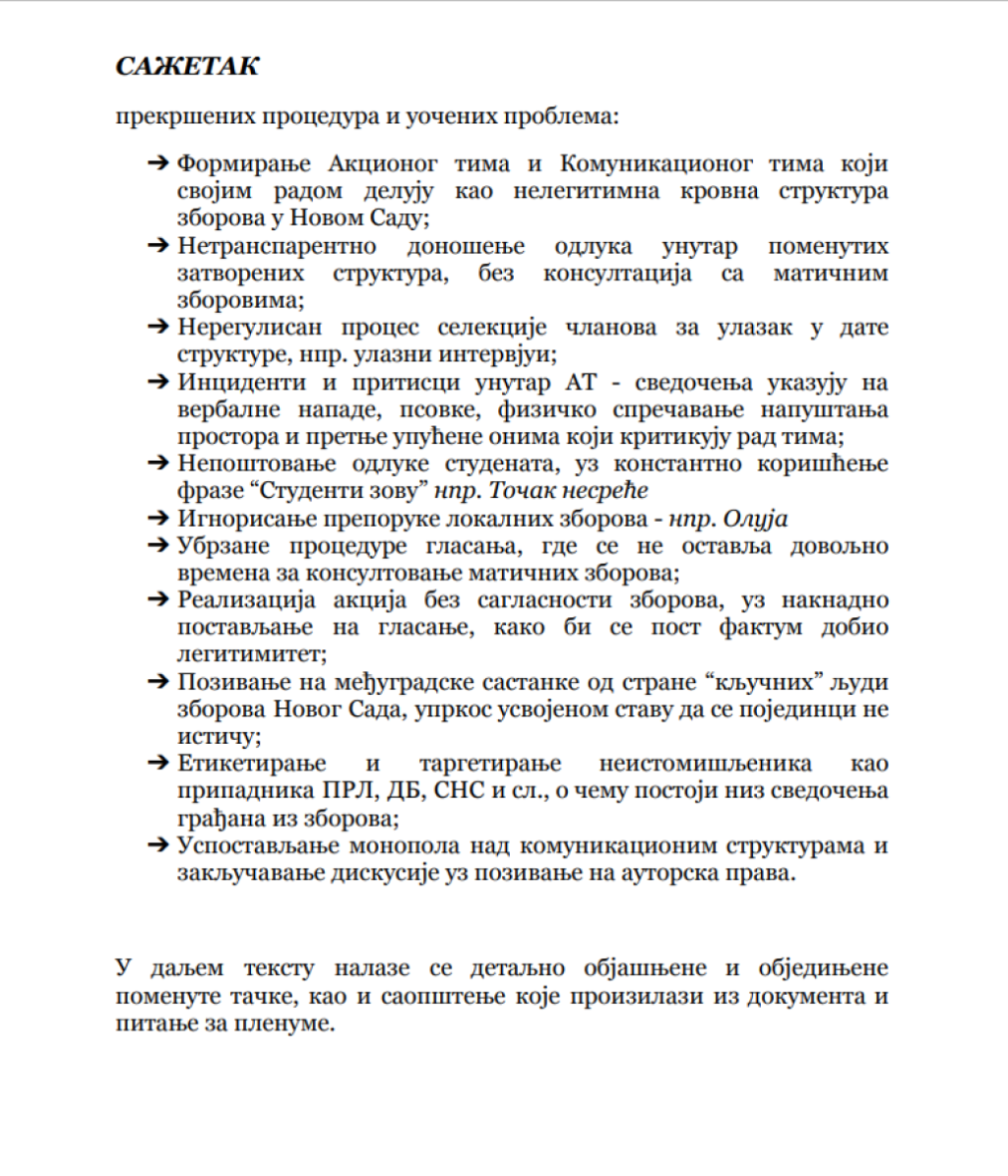 Da više ne mogu da se sastave i da u njihovim redovima ne postoji ono "cveće i proleće" kojim su se toliko dičili pre godinu dana, kada su počeli rušenje Srbije na ulicama gradova širom zemlje, pokazuje i dokument koji je sastavila grupa takozvanih studenata, a koji je usmeren protiv "zborova" sa sve dokazima i svedočenjima "zaštićenih svedoka". Tema ovog dokumenta, u koji je Informer imao uvid, je jedna - "kako su zborovi privatizovani i samovoljno rade šta hoće, a pozivaju se na "studente".