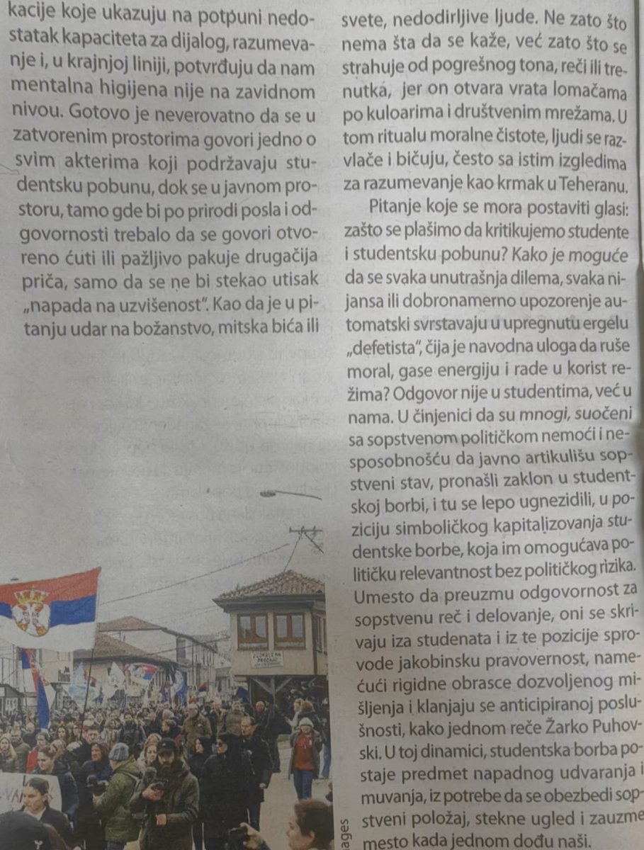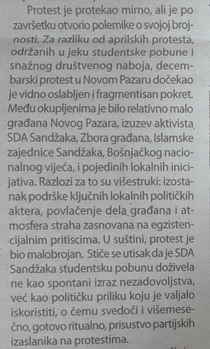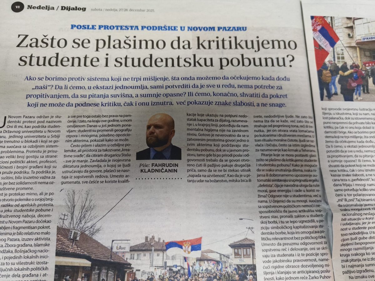 Opozicioni kolumnista Fahrudin Kladničanin je u vikend izdanju "Danasa" najoštrije iskritikovao studente u blokadi. On je nedavni skup u Novom Pazaru ocenio kao malobrojan, a istovremeno i optužio partiju SDA za preuzimanje istog. Otkrio je i da o studentima u četiri zida pričaju jedno, a u javnosti nešto sasvim drugo, a sve iz, kako je naveo, straha da ne udare na ta "mitska bića" i njihovu "uzvišenost". Kladničanin je konstatovao i da se zapravo iza cele te priče skrivaju nesposobni i muvare, koji samo vrebaju priliku da zajašu vlast.