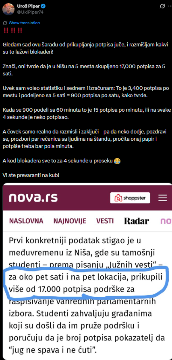 "Gledam sad ovu šaradu od prikupljanja potpisa juče, i razmišljam kakvi su to lažovi blokaderi! Znači, oni tvrde da je u Nišu na 5 mesta skupljeno 17.000 potpisa za pet sati.