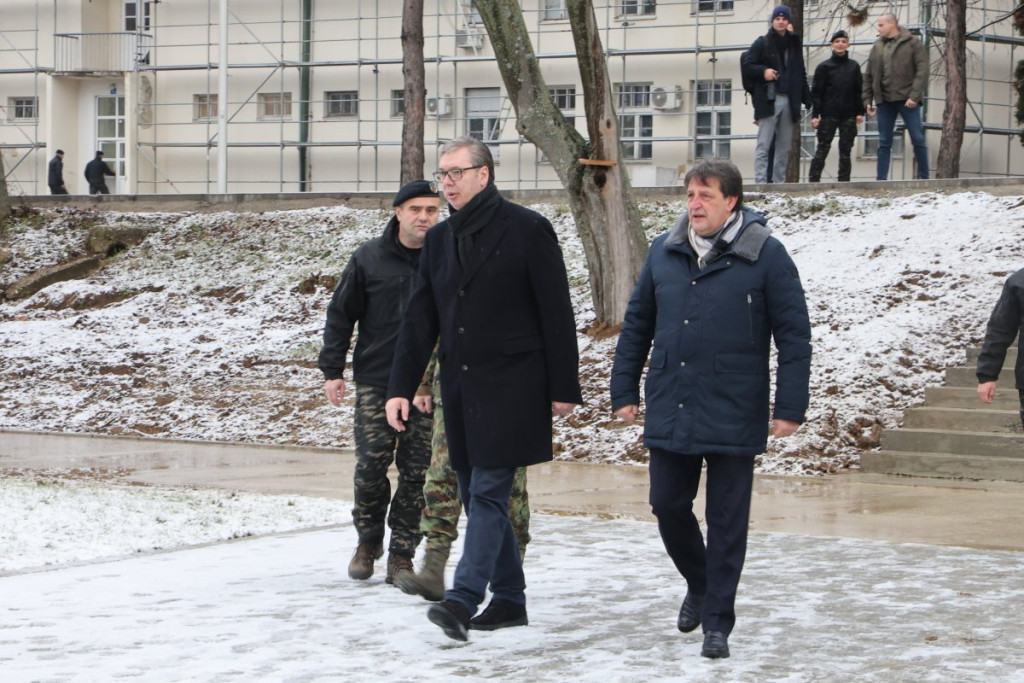 Aleksandar Vučić radove obilazi u kasarni ''Vasa Čarapić'' u Beogradu, saopštila je ranije služba za saradnju s medijima predsednika Republike.