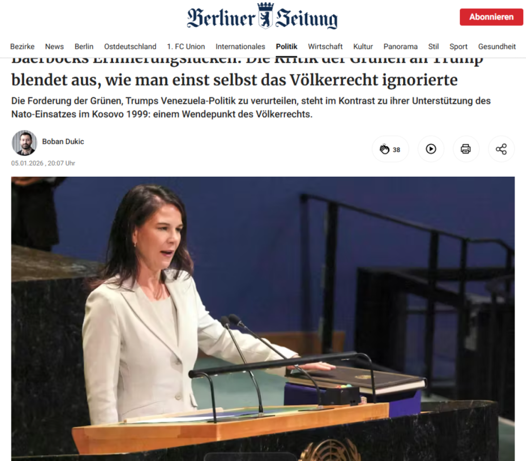 Analena Berbok, bivša šefica nemačke diplomatije i predsednica Generalne skupštine Ujedinjenih nacija naprasno se setila međunarodnog prava iako su ona i njena stranka patili od političke amnezije kada je međunardno prava brutalno zgađeno na srpskom Kosovu i Metohiji.