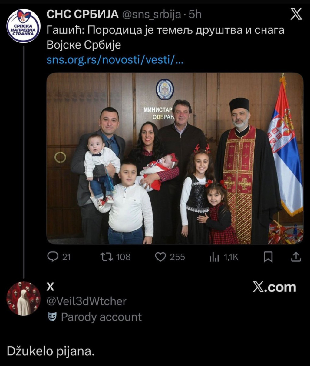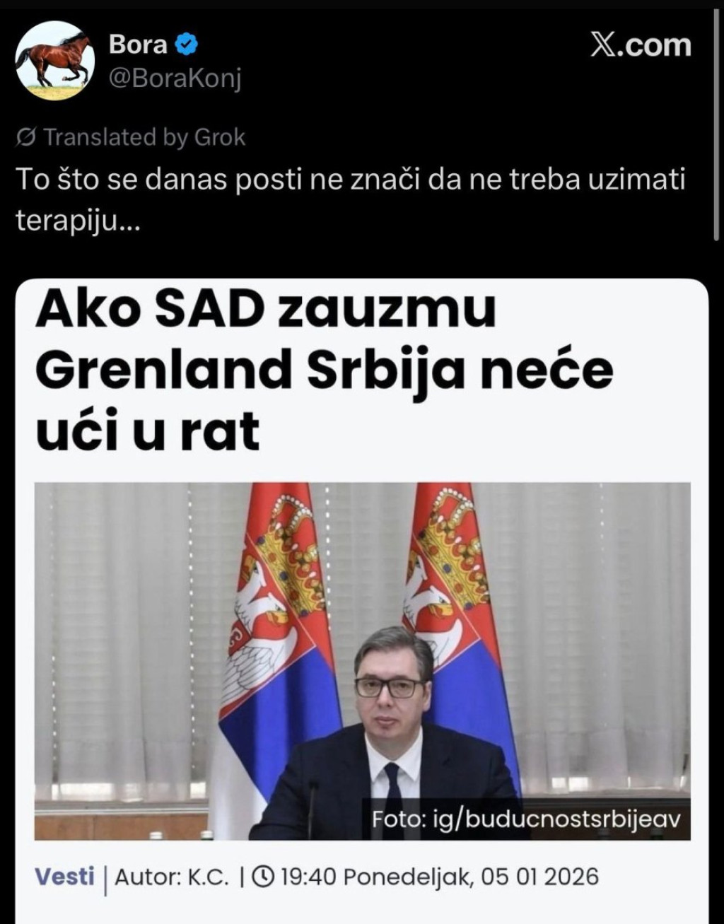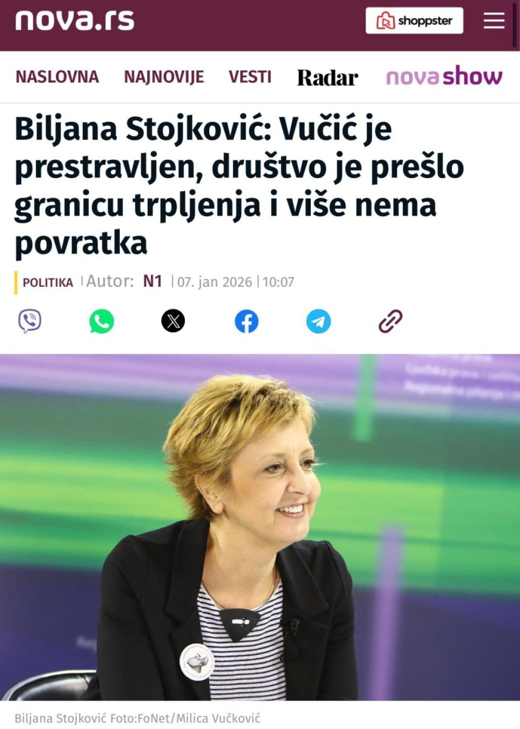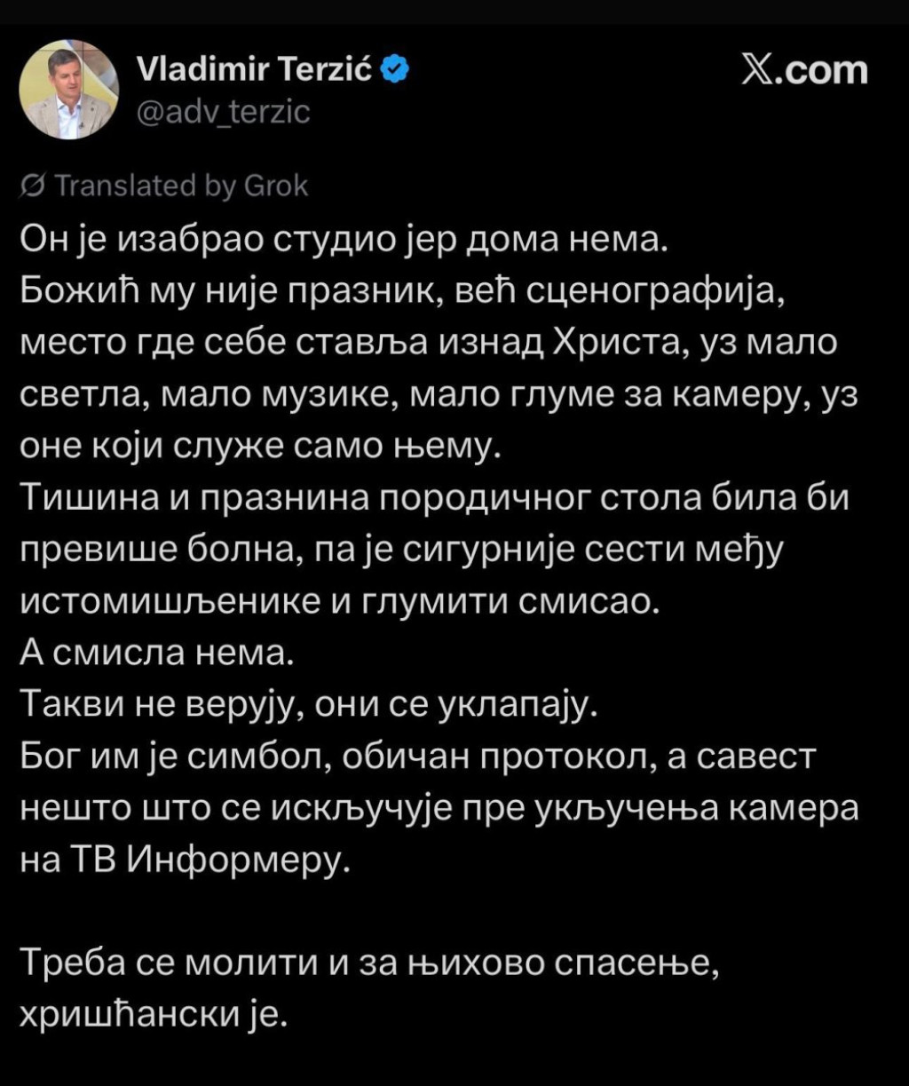 Председнику Србије се свакодневно упућују гнусне увреде и претње и то не само преко друштвених мрежа, већ и преко тЈајкунских медија. Који су током прошле године постали и званично платформа за ширење лажи и генерисање насиља. А када се то радио и за Божић, то посебно показује примитивизам власника изговорених речи и професионализам тзв новинара. Да је јавност знала да им је звезда водиља , тој елити, краљица конспирације, госпођа Јованка, разумела би боље колико помрачење ума доживљавају. Несвакидашње помрачење ума. Али о покојнику све најбоље. Србија иде напред. Радом, знањем, изградњом и здравим разумом.