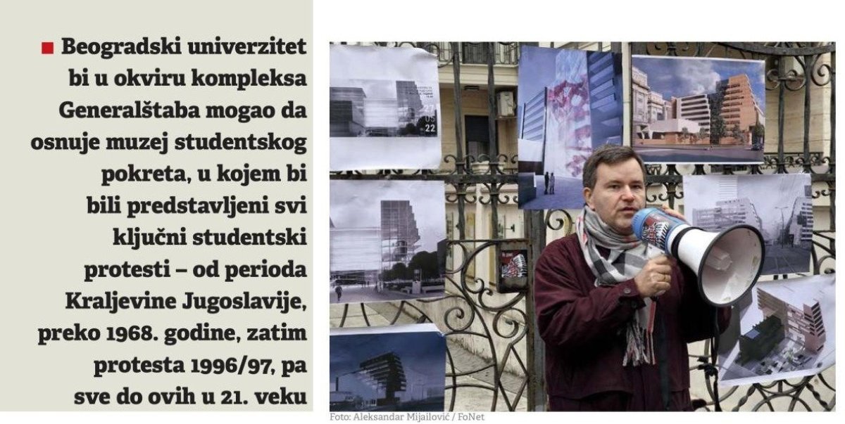 "Beogradski univerzitet bi u okviru kompleksa Generalštaba mogao da osnuje muzej studentskog pokreta, u kojem bi bili predstavljeni svi ključni studentski protesti - od perioda Kraljevine Jugoslavije - preko 1968. godine, zatim protesta 1996/7, pa sve do ovih u 21. veku" - rekao je Lajbenšperger.