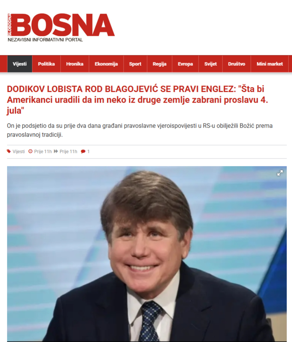 Rod Blagojević, bivši guverner američke savezne države Illinois, uzburkao je duhove u političkom Sarajevu svojom izjavom o proslavi Dana Republike Srpske 9. januara.