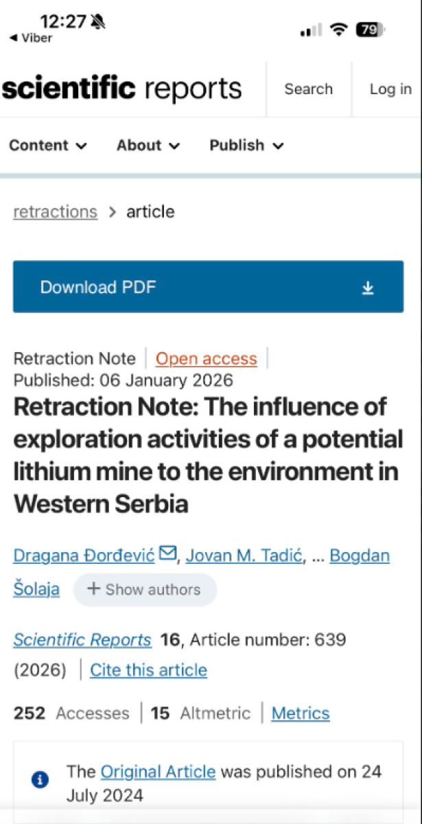 Takozvani naučni članak “Uticaj istraživačkih aktivnosti potencijalnog rudnika litijuma na životnu sredinu u zapadnoj Srbiji” odlukom uredništva ovog stručnog naučnog časopisa povučen je pre nekoliko dana zbog niza grešaka koje su napravili autori teksta.