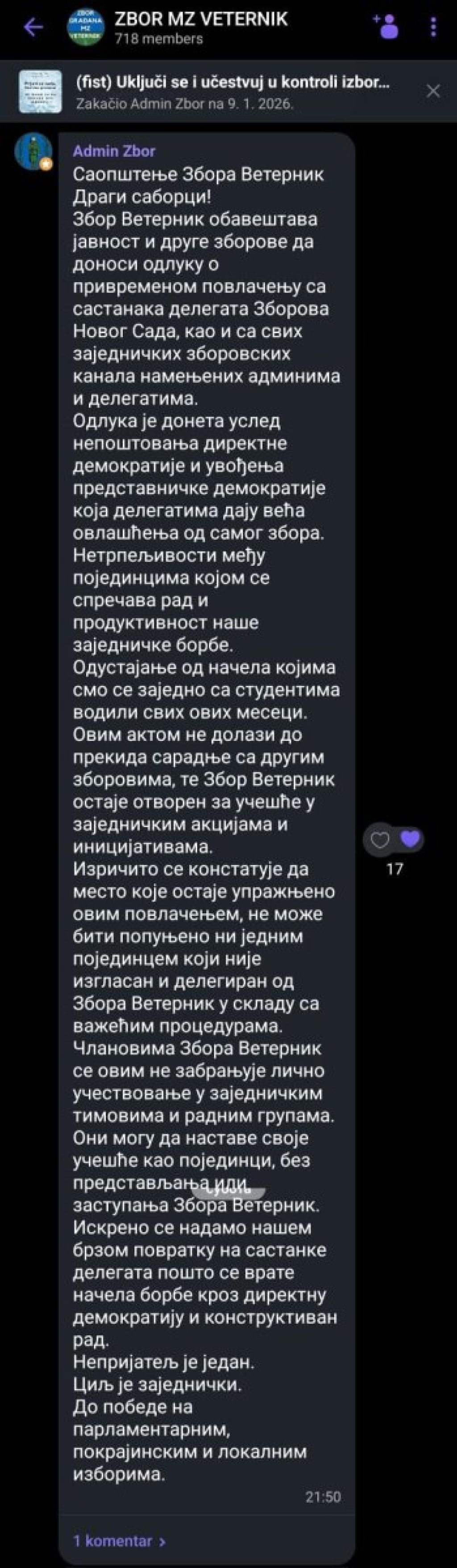 - Dragi saborci, Zbor Veternik obaveštava javnost i druge zborove da donosi odluku o privremenom povlačenju sa sastanaka delegata Zborova Novi Sad, kao i sa svih zajedničkih zborovskih kanala namenjenih adminima i delegatima. Odluka je doneta usled nepoštovanja direktne demokratije i uvođenja predstavničke demokratije koja delegatima daju veća ovlašćenja od samog zbora. Netrpeljivosti među pojedincima kojom se sprečava rad i produktivnost naše zajedničke borbe - istaknuto je u poruci.