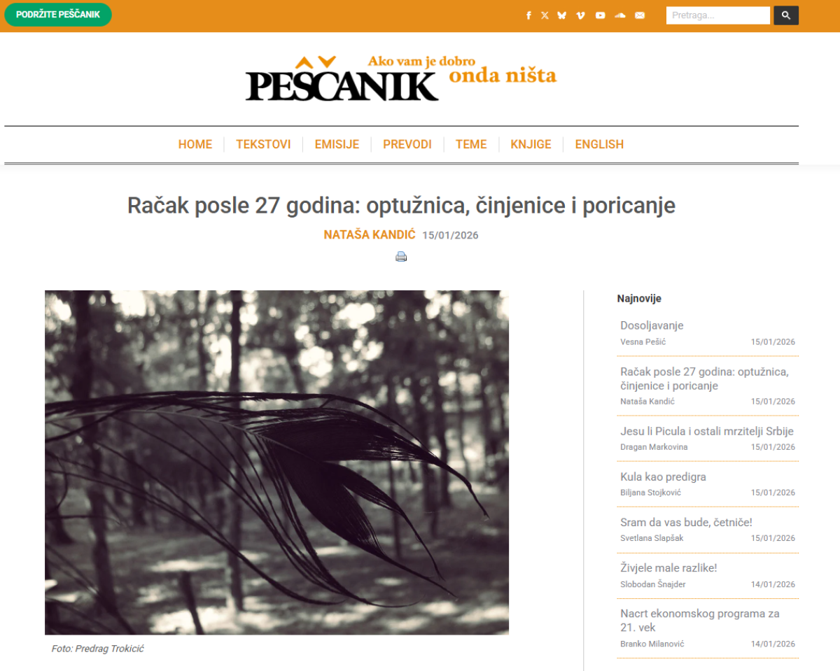 - Na 27. godišnjicu masakra u Račku, Kosovsko specijalno tužilaštvo podiglo je optužnicu protiv 21 pripadnika Vojske Jugoslavije i MUP-a Srbije za ubistvo najmanje 42 albanska civila. Sudeći po inicijalima, među optuženima su general Krsman Jelić, komandant 243. mehanizovane brigade VJ, i policijski general Goran Radosavljević - Guri, komandant operacije u Račku. Optuženi se terete za ubistva, nečovečno postupanje, uništavanje imovine, deportaciju i etničko čišćenje civilnog stanovništva - piše u prva tri posta na Iksu Kandićeva, a iste tvrdnje ponovila je i u tekstu koji je objavio ekstremistički Peščanik.