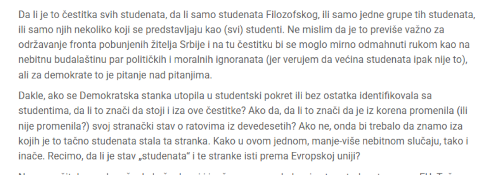 - Dakle, ako se Demokratska stanka utopila u studentski pokret ili bez ostatka identifikovala sa studentima, da li to znači da stoji i iza ove čestitke? Ako da, da li to znači da je iz korena promenila (ili nije promenila?) svoj stranački stav o ratovima iz devedesetih? Ako ne, onda bi trebalo da znamo iza kojih je to tačno studenata stala ta stranka. Kako u ovom jednom, manje-više nebitnom slučaju, tako i inače. Recimo, da li je stav „studenata" i te stranke isti prema Evropskoj uniji? - navodi Ilić.