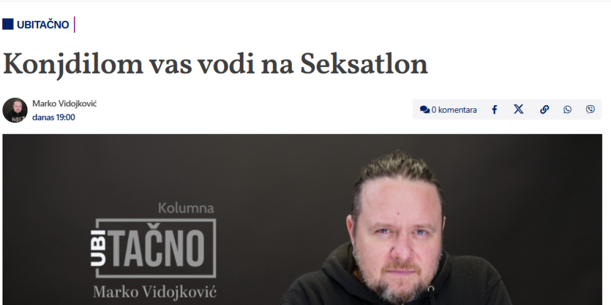 "Svi mi što pasionirano pratimo Informer, kako bismo dokumentovali najnovije napade na nas, našli smo se u čudu prethodnih nedelja. Svaki put kad odem na njihovu stranicu, kao prva vest mi iskače nekakav Seksatlon. Ne samo to. Seksatlon je i prva vest među informerskim 'top pričama'. A pismenim novinarima Informera stalno se potkrade slovna greška, pa iz naziva Seksatlon uporno izbacuju prvo slovo", piše u Vidojkovićevoj kolumni.